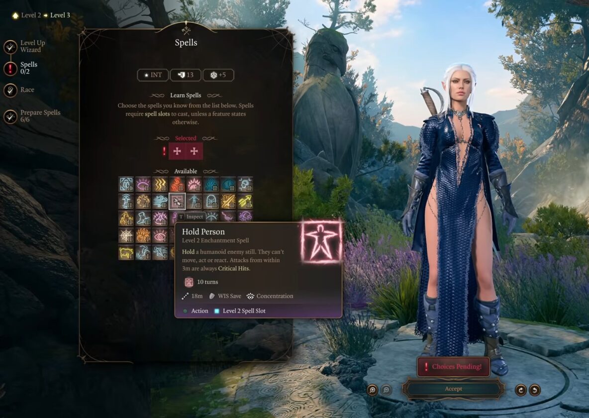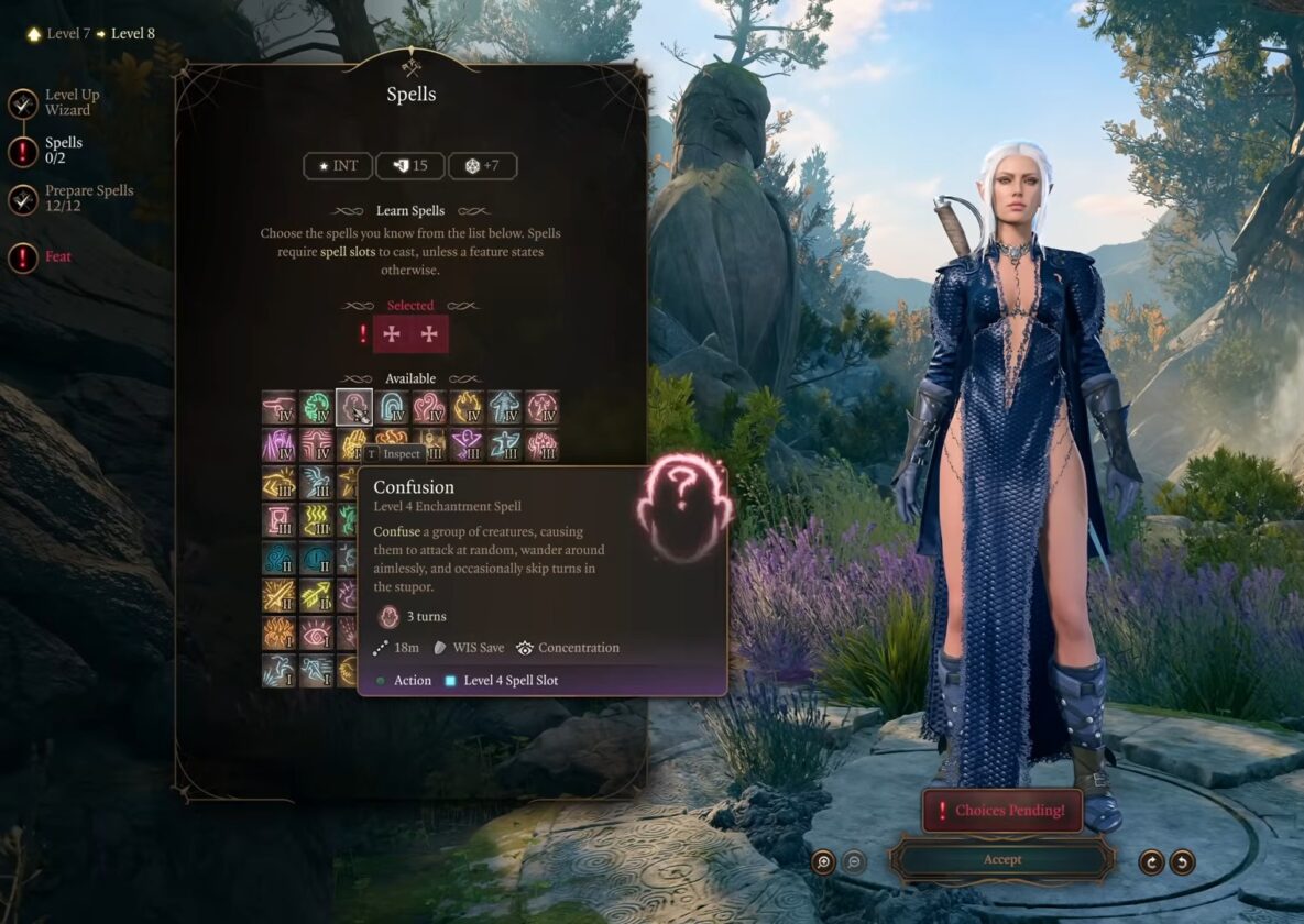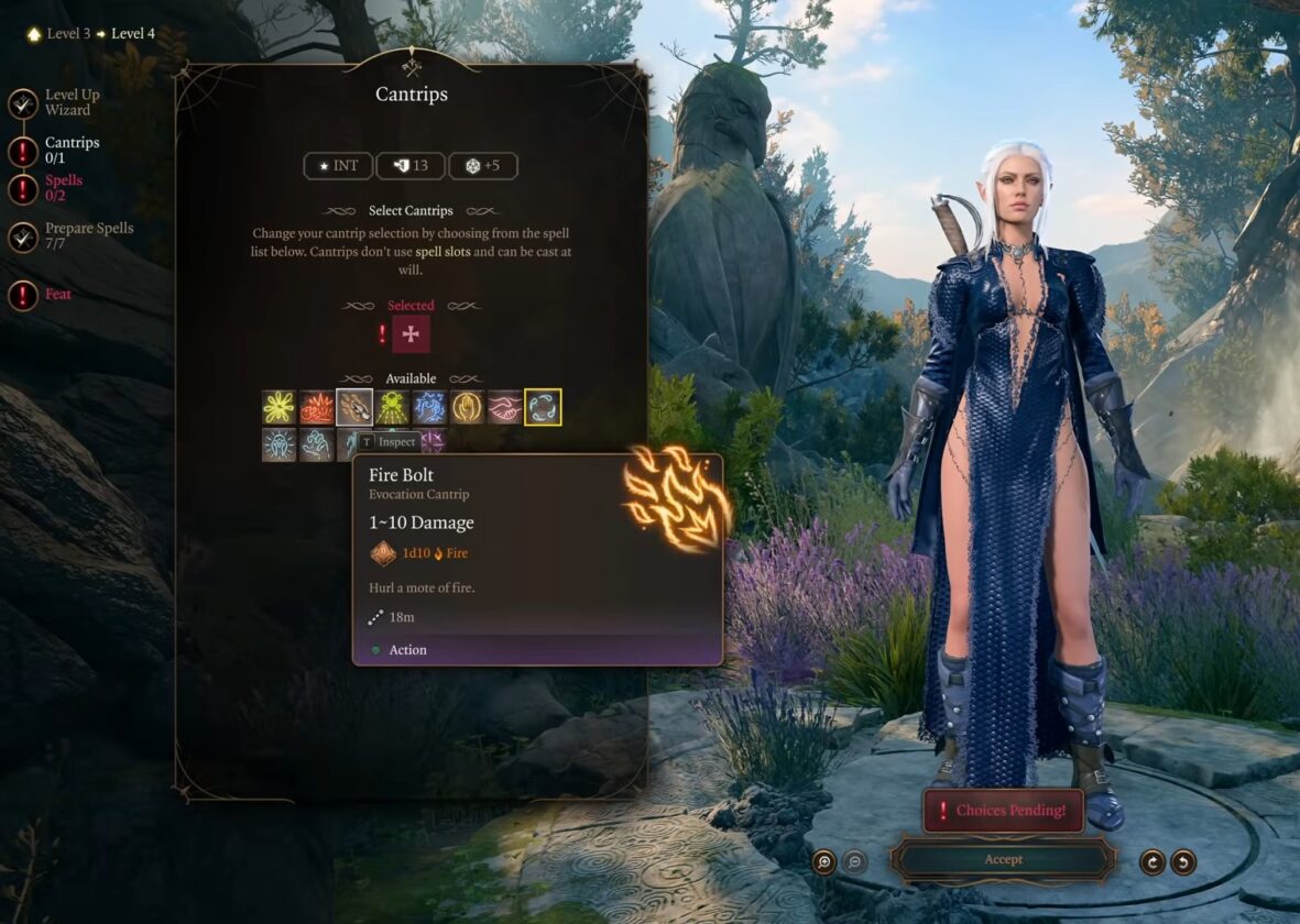 Al livello 1 per la classe Wizard, è possibile effettuare le seguenti selezioni dopo aver attraversato la schermata di creazione del personaggio.