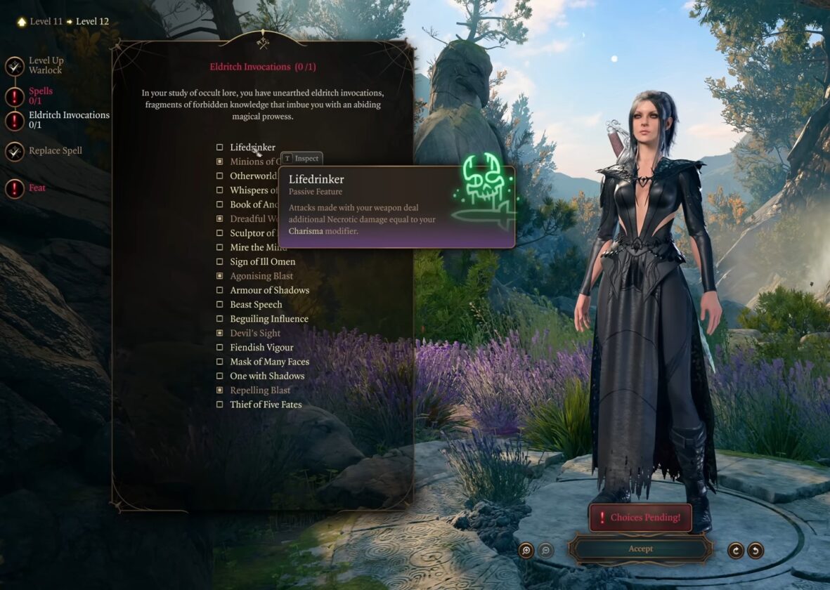Al livello 12, il tuo HP aumenterà a 87 da 80. Per la tua invocazione finale di Eldritch, seleziona il bevitore di vita.