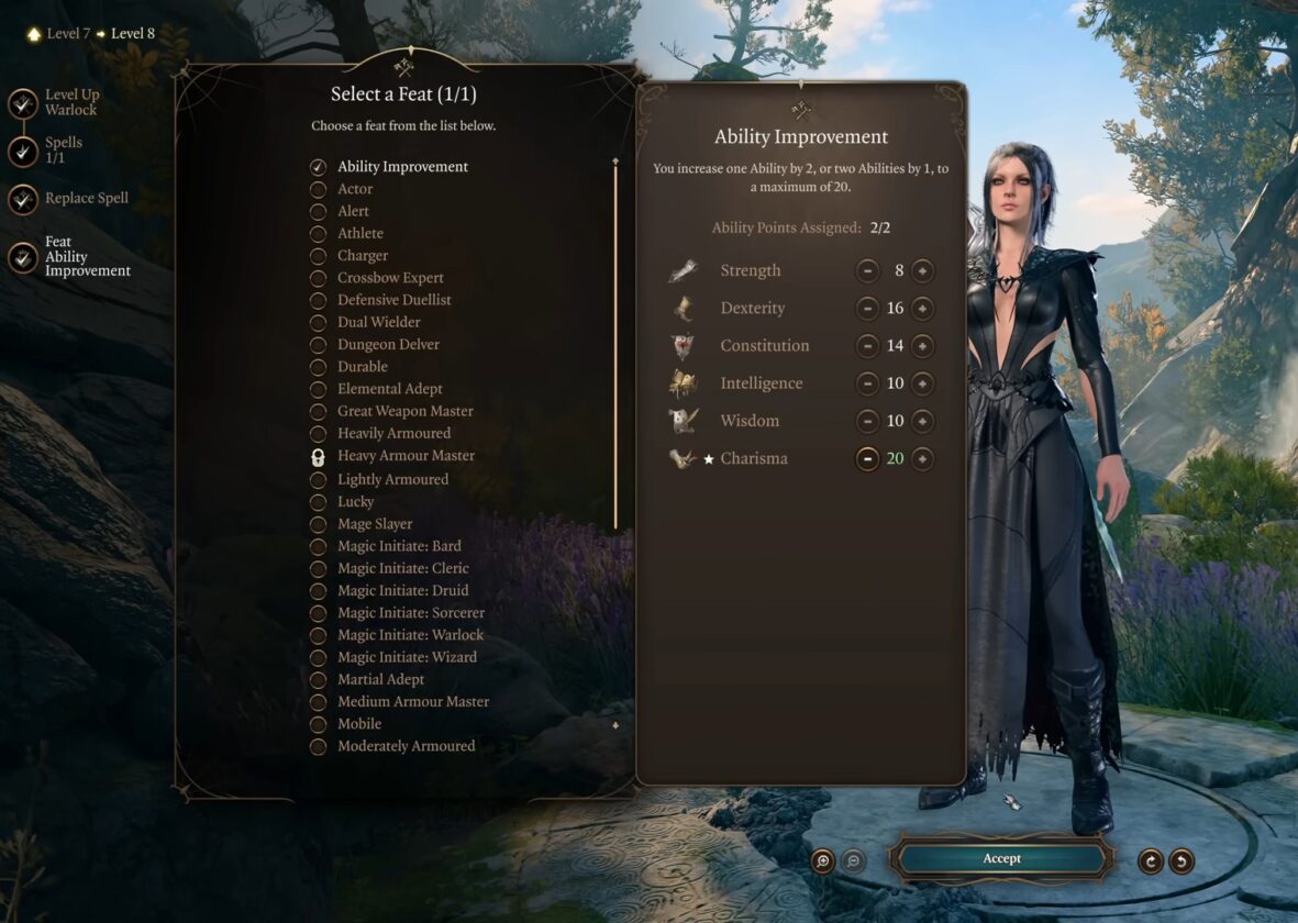 Feat: Abilità Miglioramento. Investi entrambi i punti in Carisma Stat per aumentarlo a 20.
