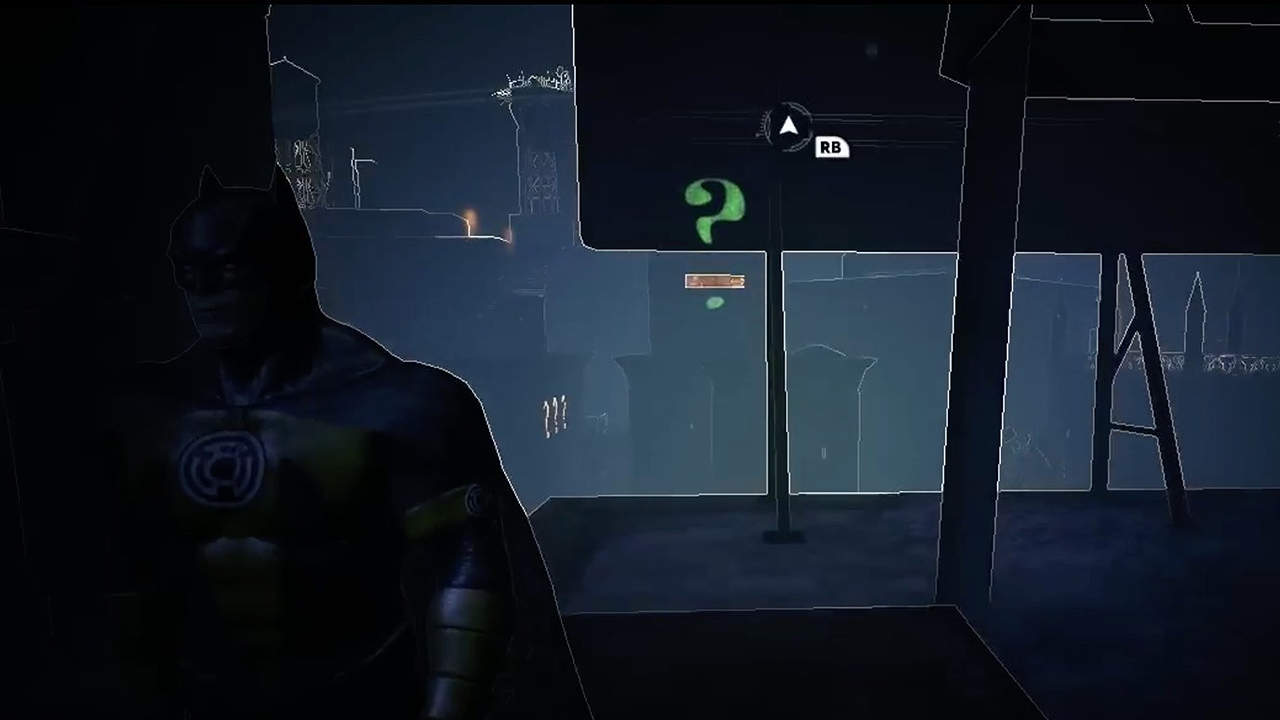 Il punto tuttavia sarà nascosto a Batman. Per rivelare il punto, equipaggia la tua Charge elettronica e spara alla finestra proprio di fronte al cartellone pubblicitario. Ciò farà sì che la finestra si abbassi e riveli il punto. Allinea il punto stando sotto il cartellone e risolvi il primo enigma.