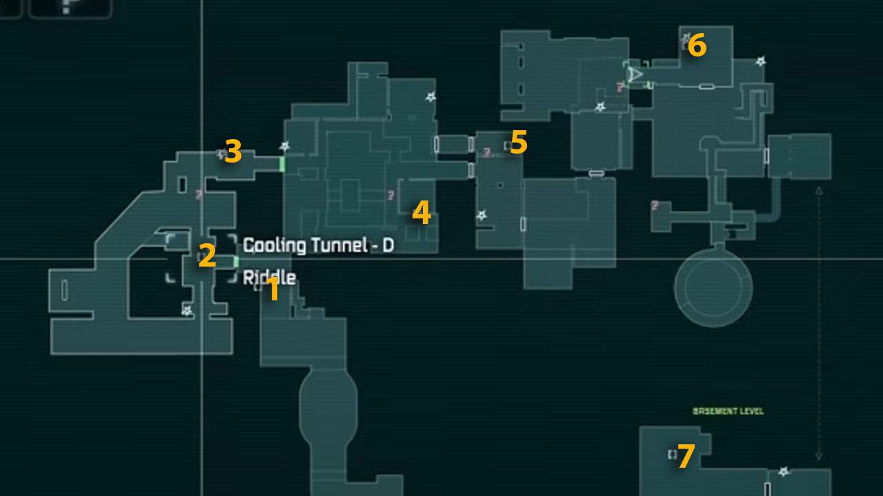 All’interno della sezione inferiore del tunnel di raffreddamento, la parte occidentale dell’acciaieria, c’è un punto interrogativo verde sulla parete nord dietro la scala. Puoi vederlo con il tuo Detective Vision.