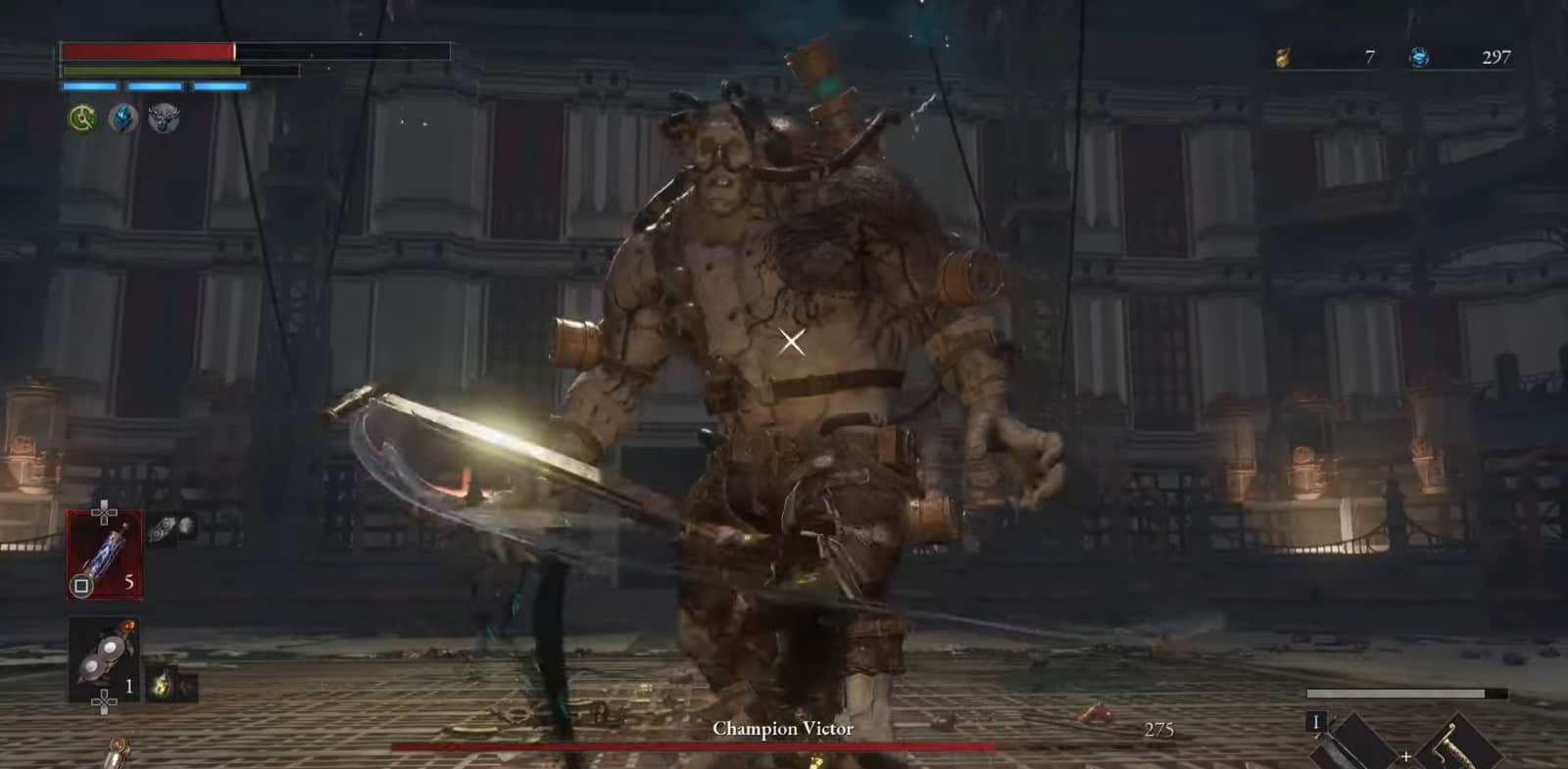 Sii pronto ad attaccare con attacchi rapidi che gli daranno fuoco, causandogli così danni da fuoco. Proverà combo come attacchi furiosi e pugni allo stomaco per danneggiarti a distanza ravvicinata. Sii attento e scappa quando vedi il Campione Victor finire in Lies of P.