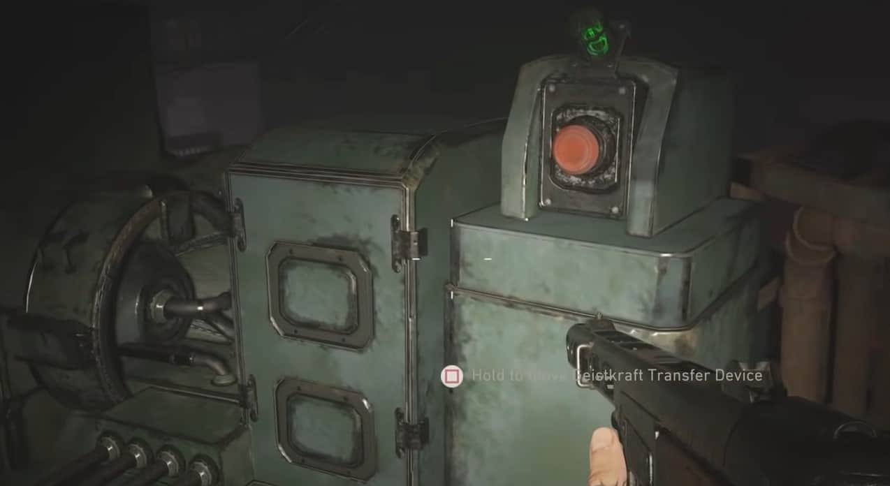Dopo aver interagito con la manovella, sali le scale nella sala di comando e cerca il pulsante rosso da premere. Così facendo attiverai il dispositivo Geiskraft Transfer. Quindi scendi le scale e ci sarà di nuovo un cerchio rosso con un gruppo di nemici. Entra nel cerchio e continua a uccidere gli zombi per caricare il dispositivo.
