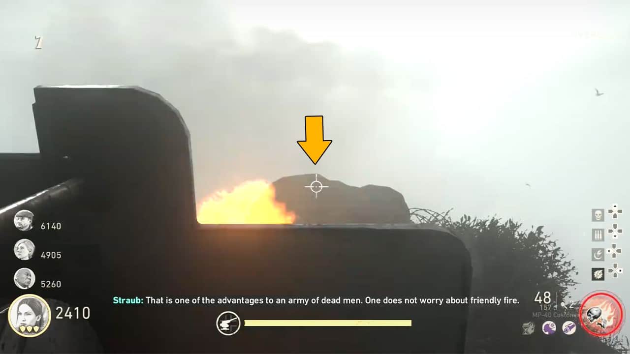 Il prossimo passo è tornare al Corpse Gate e interagire con il terminale sul lato destro. Ciò che farà è generare uno zombie porta-artiglieria che dovrai scortare al bunker di artiglieria. Una volta che lo zombi amico raggiunge il bunker, metterà giù una parte che carica lo sbarramento di artiglieria che dovrai caricare uccidendo gli zombi attorno ad esso.