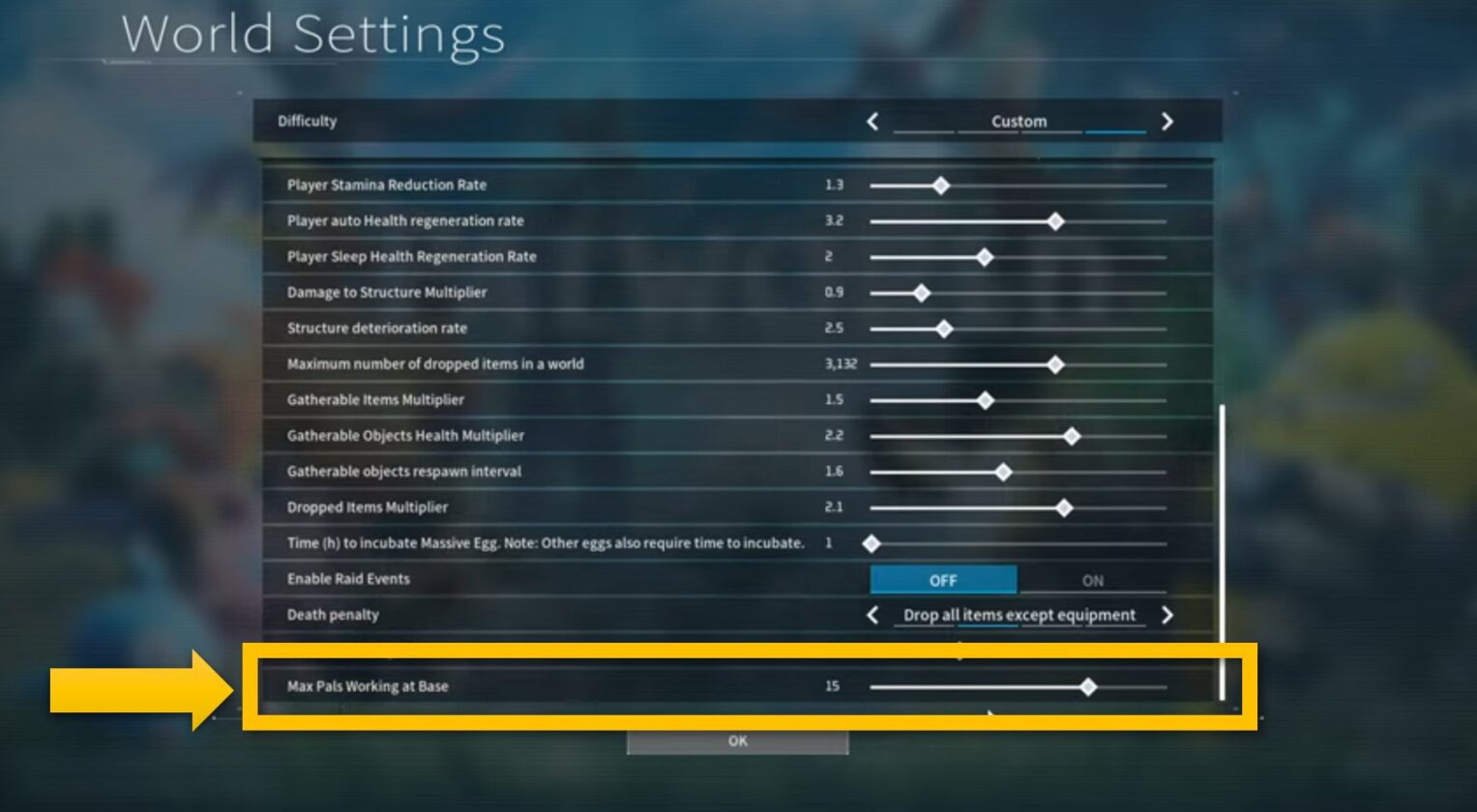 - Potrai osservare molte opzioni di difficoltà nelle Impostazioni mondo. Scorri fino in fondo e alla fine troverai un’impostazione che menzionerà Max Pals Working at Base in Palworld.