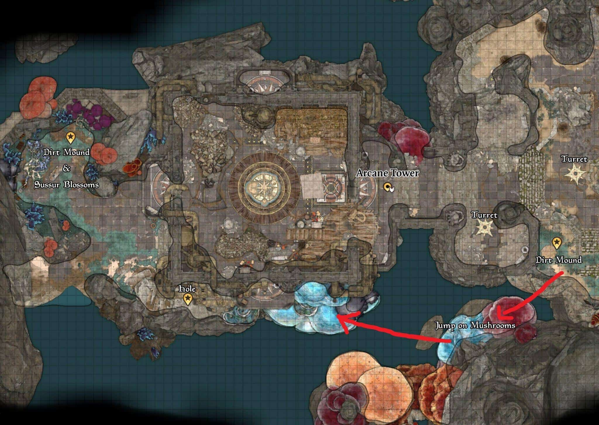 Evita le torrette nascondendoti dietro gli oggetti, usa Concedi il volo, Passo nebbioso O Salto saltare a destra sul lato sinistro della torre sui funghi per aggirare le torrette e raggiungere il cortile della Torre Arcana in BG3. Un altro modo per entrare nella torre senza essere cancellati dalle torrette è usare i fiori magici di Sussur Bloom, la nostra guida qui copre i fiori in dettaglio.