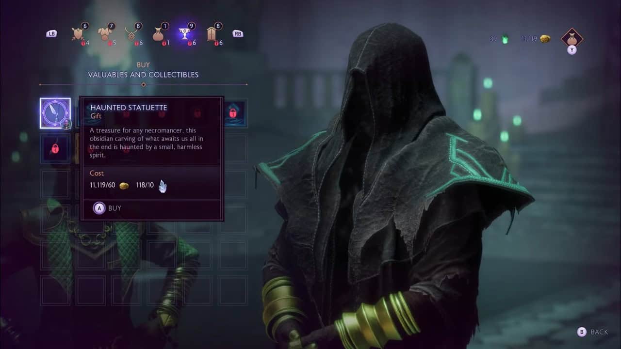 Puoi trovare la statuetta stregata nel Sale della necropoli, che può essere acquistato da Dello Spirito Inquieto venditore di fazioni. Questo oggetto ti riporterà indietro di 60 oro e 10 cristalli impeccabili.