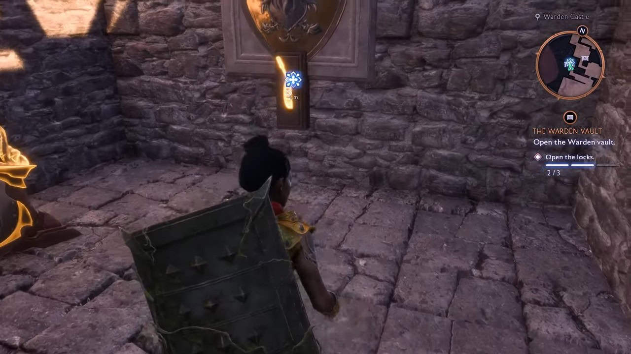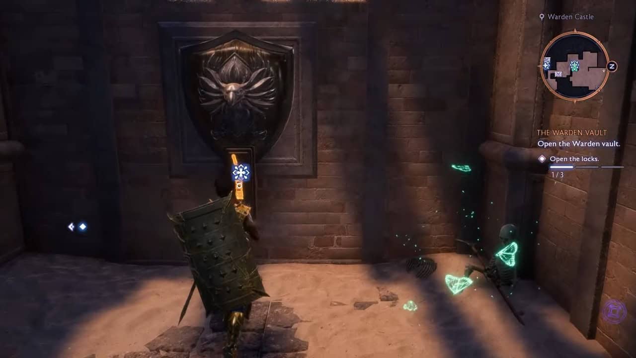 Quando entri, puoi individuare tre scudi illuminati davanti a una porta di ferro. Interagisci con la leva per aprire la porta; al suo interno troverai ancora un’altra leva con cui interagire per aprire il primo lucchetto.