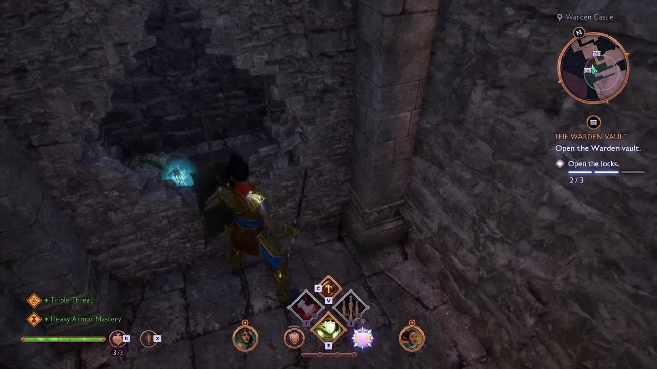 Successivamente, usa nuovamente l’abilità di fuoco di Taash per rimuovere il Drakestone vescicante. Una volta chiarito, vai avanti e troverai una nota con un indizio e tre sigilli su un muro di pietra. Ora dovrai trovare e sbloccare tre lucchetti per accedere al caveau e la missione inizierà Dragon Age: La Guardia del Velo.
