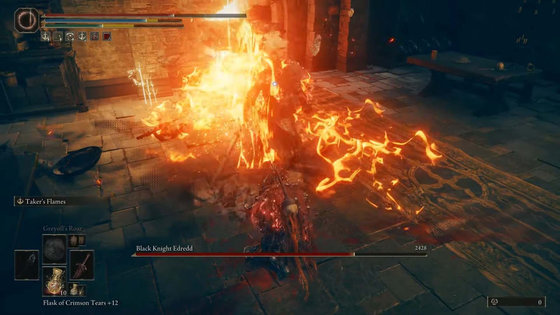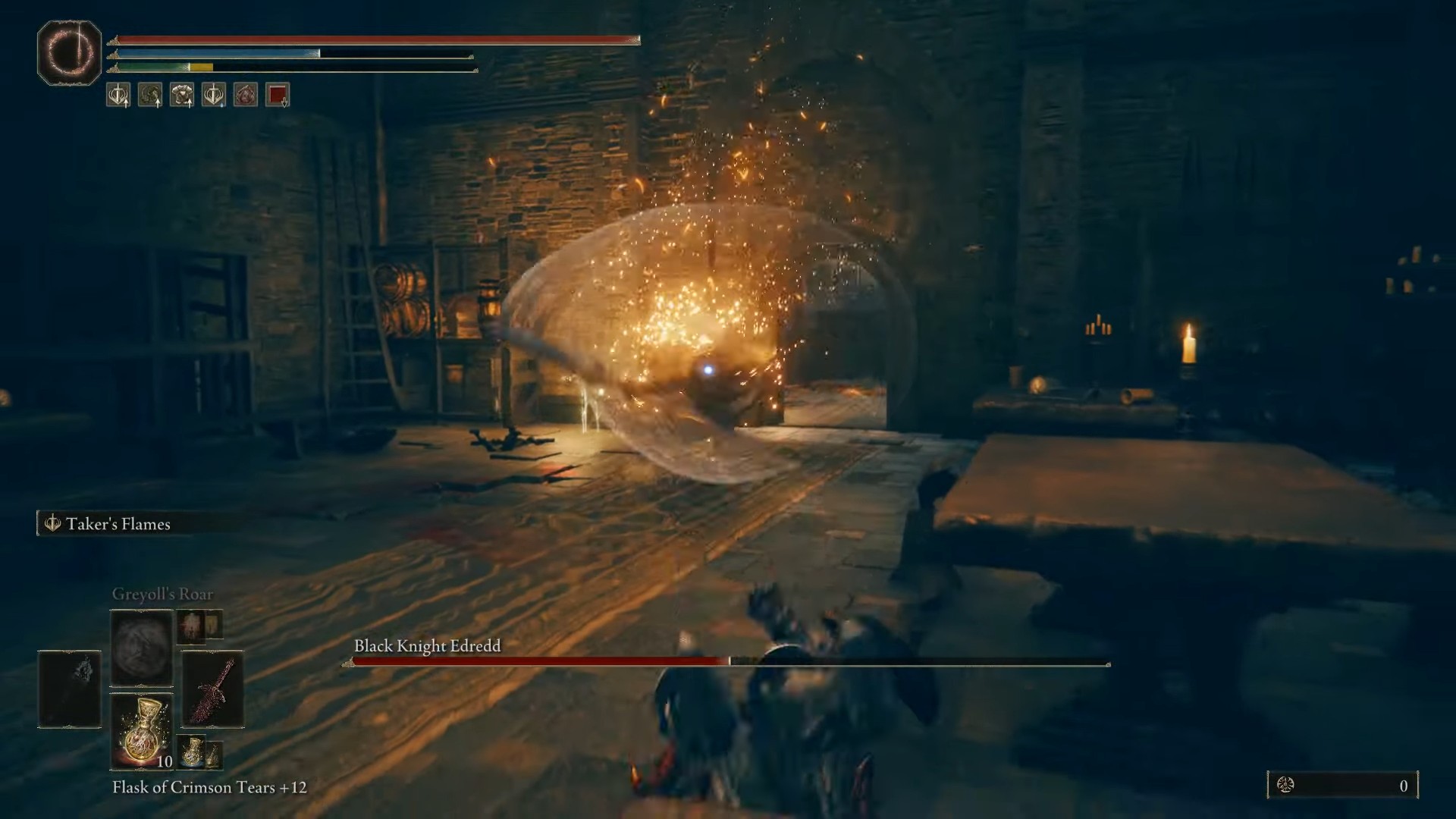 Questo boss è debole per fulmini, veleno, marciume scarlatto e sonno. È immune alla follia, però. Black Knight Edredd è forte contro gli attacchi di slash; Tuttavia, puoi infliggere danni enormi con Pierce.
