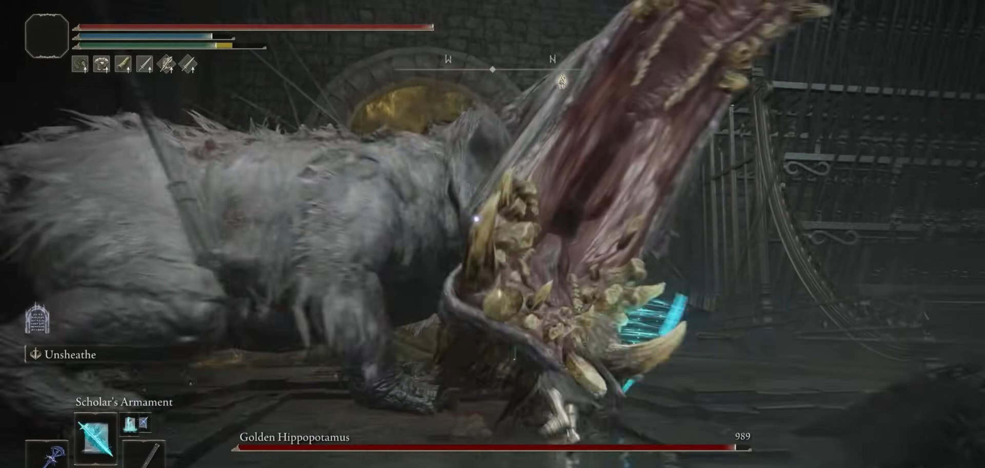 L’ippopotamo dorato è anche debole contro gli attacchi standard, Slash, Pierce e Strike. Puoi anche usare la magia e gli attacchi santi contro questo colosso per atterrare alcuni danni enormi.