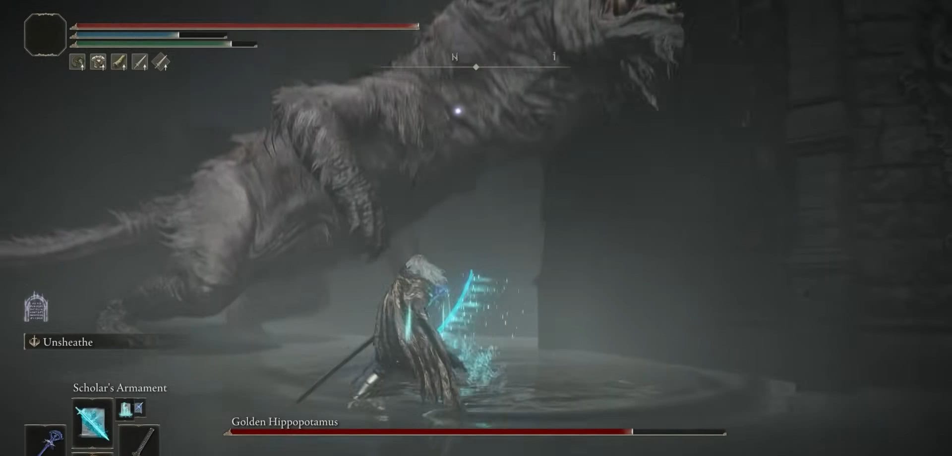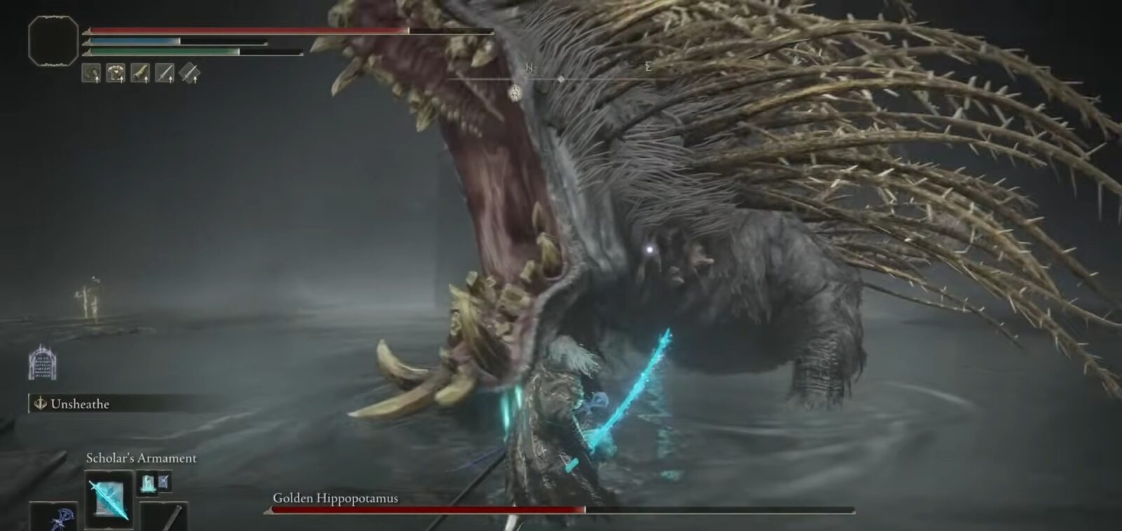 Poiché l’ippopotamo dorato è debole contro la maggior parte degli attacchi elementali, ti consigliamo di trasportare una lama blasfema completamente aggiornata o la lama di rovescio con acuta affinità.