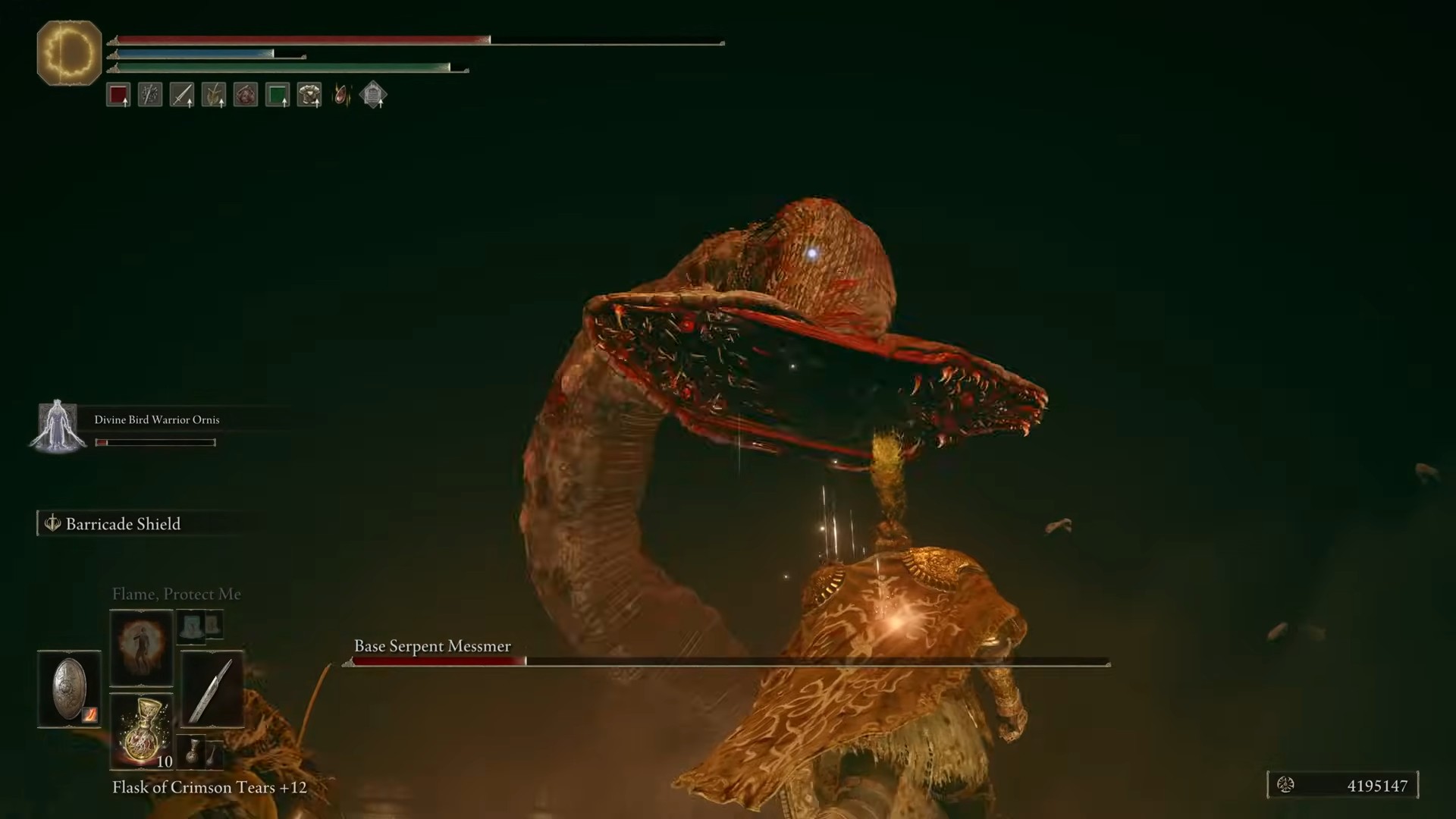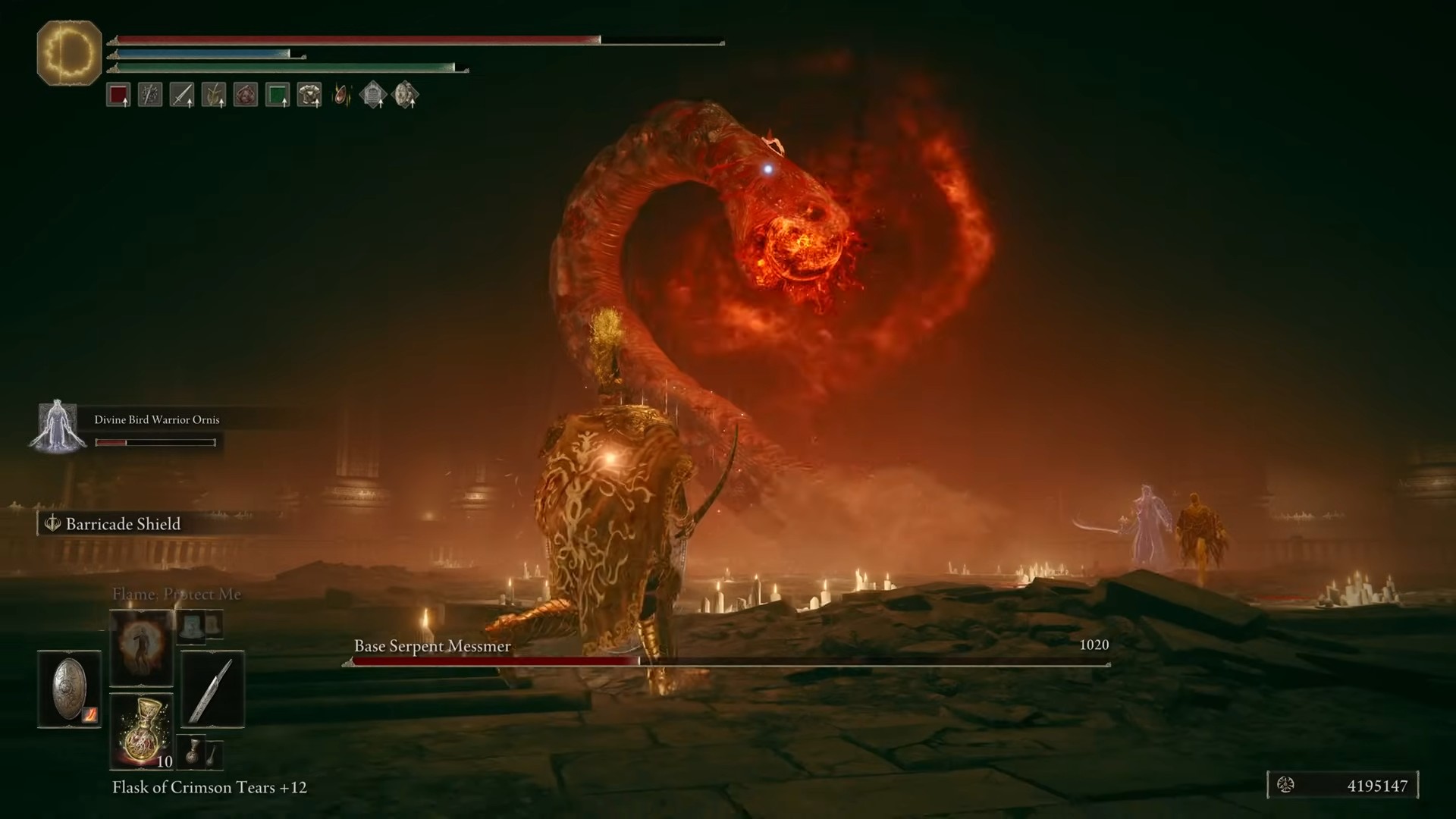 Se sopravvivi all’assalto e riduci la sua salute al 50%, un filmato innescerà in cui Messmer rimuove il sigillo di grazia di Marika dai suoi occhi e convoca il serpente primordiale.
