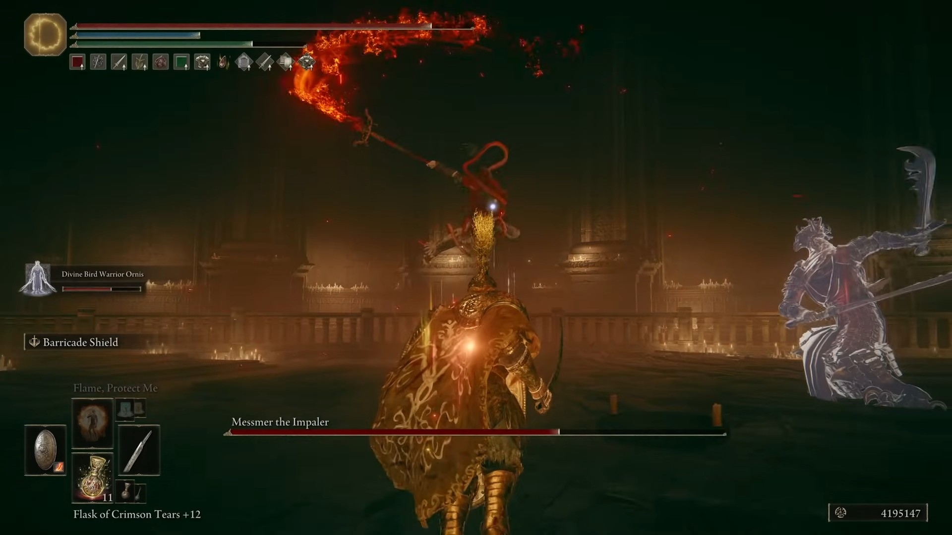 Messmer ti implementerà sulla sua lancia e infliggerà ulteriori danni al fuoco se vieni catturato. Messmer si muove a una velocità allarmante e fa un attacco di spinta con la sua lancia se provi a avvicinarti troppo.