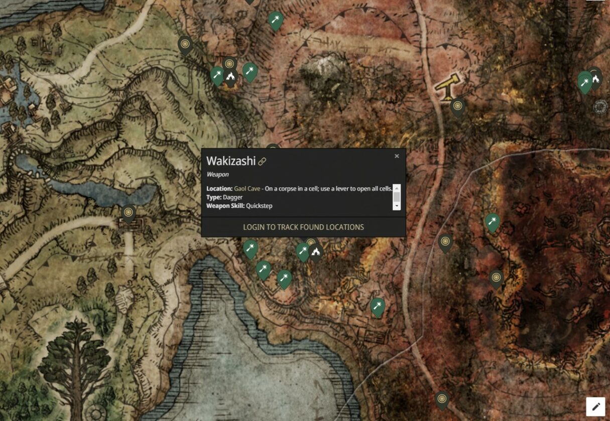 Il pugnale Wakizashi può essere trovato su un cadavere nelle profondità della Caverna della prigione. Queste catacombe sono presenti nella regione occidentale di Caelid e possono essere raggiunte viaggiando velocemente verso Astray From Caelid Highway North site of grace e poi viaggiando direttamente verso ovest. Questa caverna è presente nel muro di una scogliera e può essere sbloccata usando una chiave Stonesword. Non puoi entrare in questa caverna senza una chiave della spada di pietra.