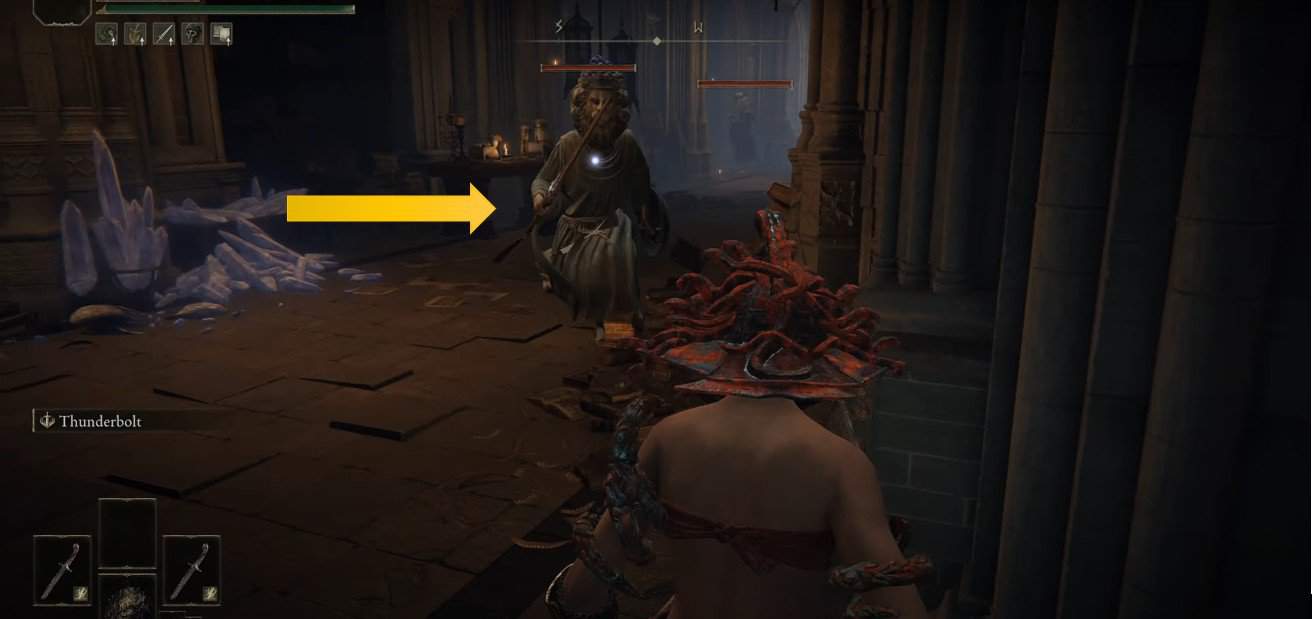 Atterrerai sul tetto dove ne incontrerai due Soldati di marionette. Eliminali entrambi usando gli attacchi Glintstone Pebble poiché questi nemici continueranno a esaminarti e sono piuttosto irritanti da affrontare e ti lanceranno frecce.