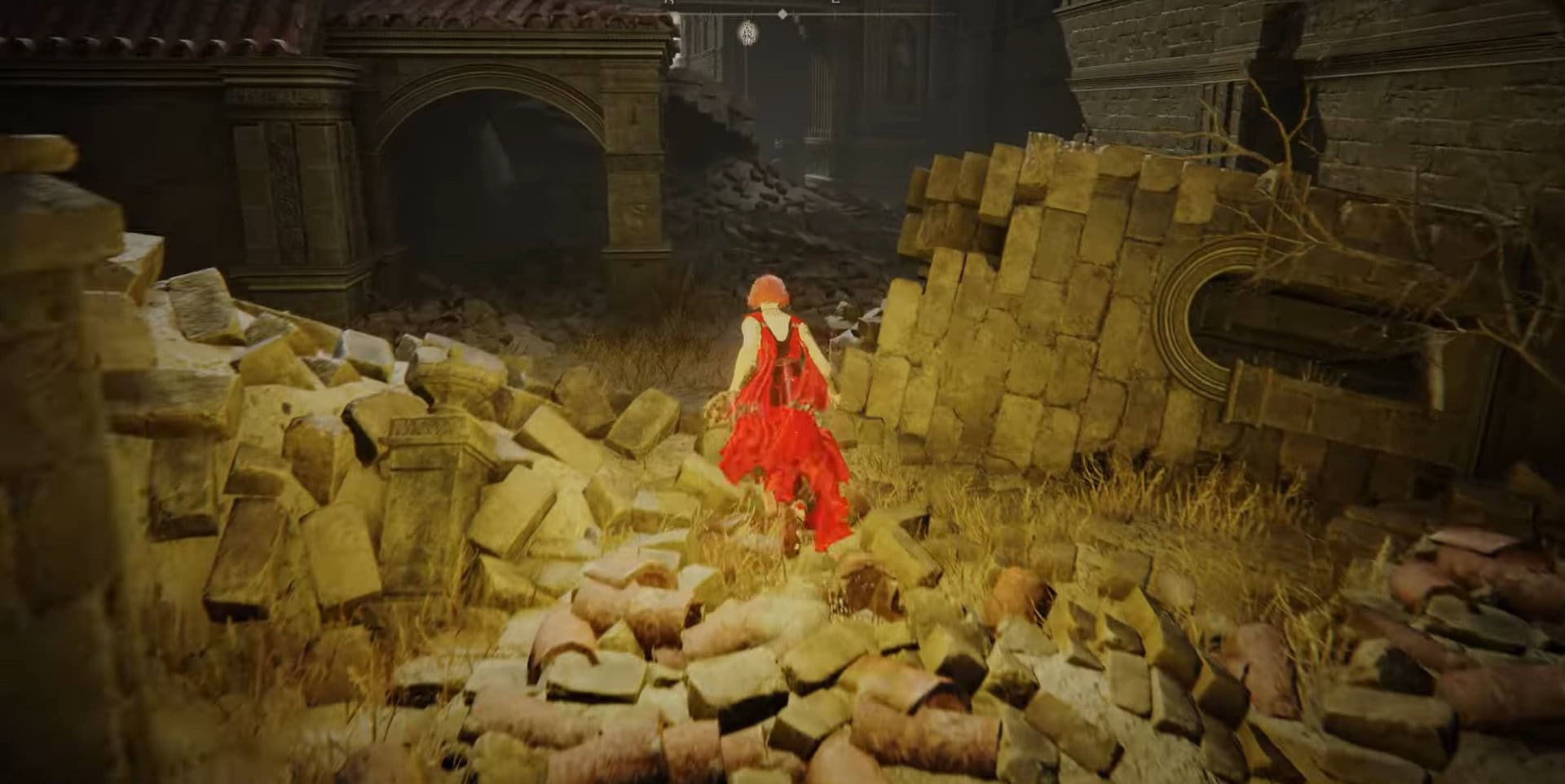 Salite le scale ed esci dalla stanza. C’è un altro set di scale che porta fuori. Una volta che sei fuori, gira a destra e scendi per raggiungere un’area con alcune macerie.