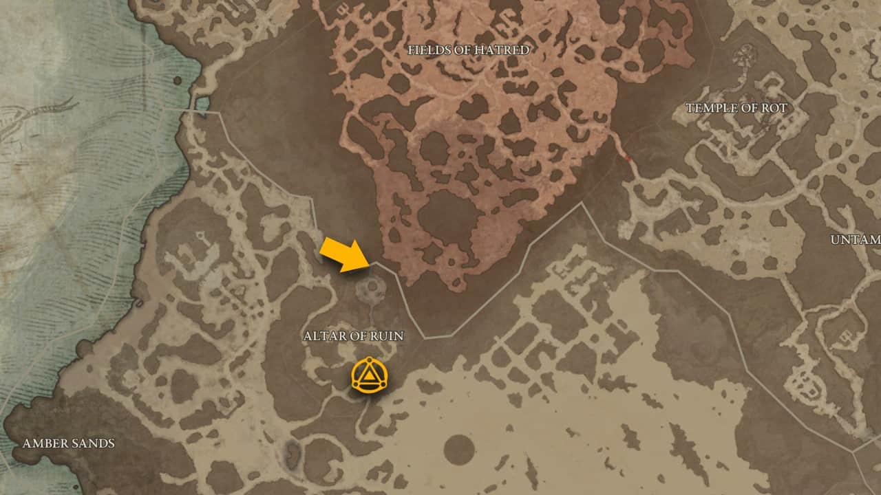 Il dungeon si trova nella parte occidentale del Santuario nella regione del Kehjistan. Dirigiti al waypoint dell’Altare della Rovina come mostrato nella mappa sopra e vai dritto all’ingresso del dungeon.