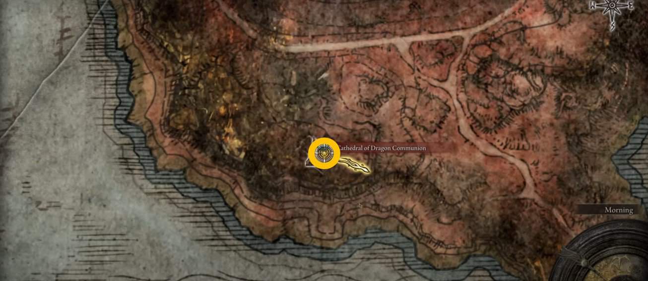 La Cattedrale della Comunione del Drago si trova a Caelid. Basta seguire la strada a sud e avventurarsi più a sud mentre la strada gira a est. Un modo rapido e semplice per arrivare qui è viaggiare verso la grazia del sito in questa località di Elden Ring.