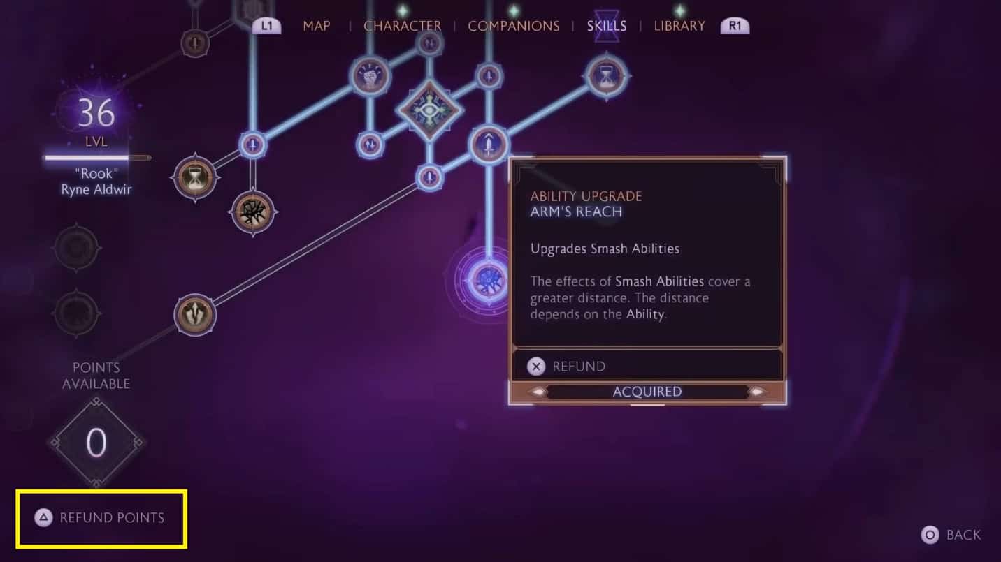 Per fare ciò, apri il menu e seleziona la scheda Abilità. Noterai l’opzione Rimborso punti nell’angolo in basso a sinistra dello schermo; cliccaci sopra e tutti i punti ti verranno immediatamente rimborsati. Puoi anche azzerare i punti spesi per le abilità individuali; passa il mouse sopra l’abilità selezionata e fai clic su rimborso opzione. Dopo aver rimborsato i punti abilità, puoi riassegnarli di conseguenza.
