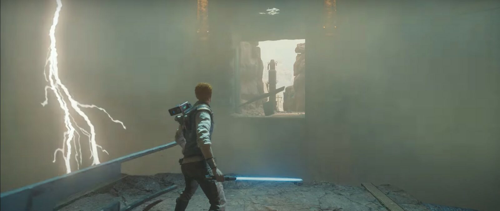 Ci sarà un’alta turbolenza in quella zona con anche fulmini tutt’intorno a te. Quindi usa l’abilità della forza per separare la porta e poi devi procedere saltando verso di essa.