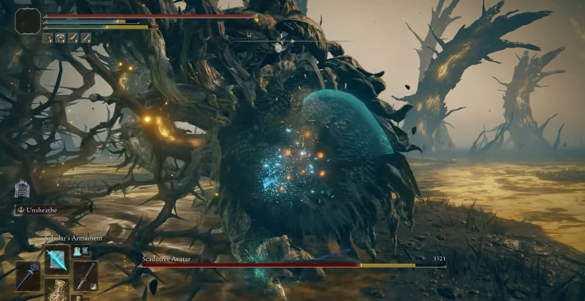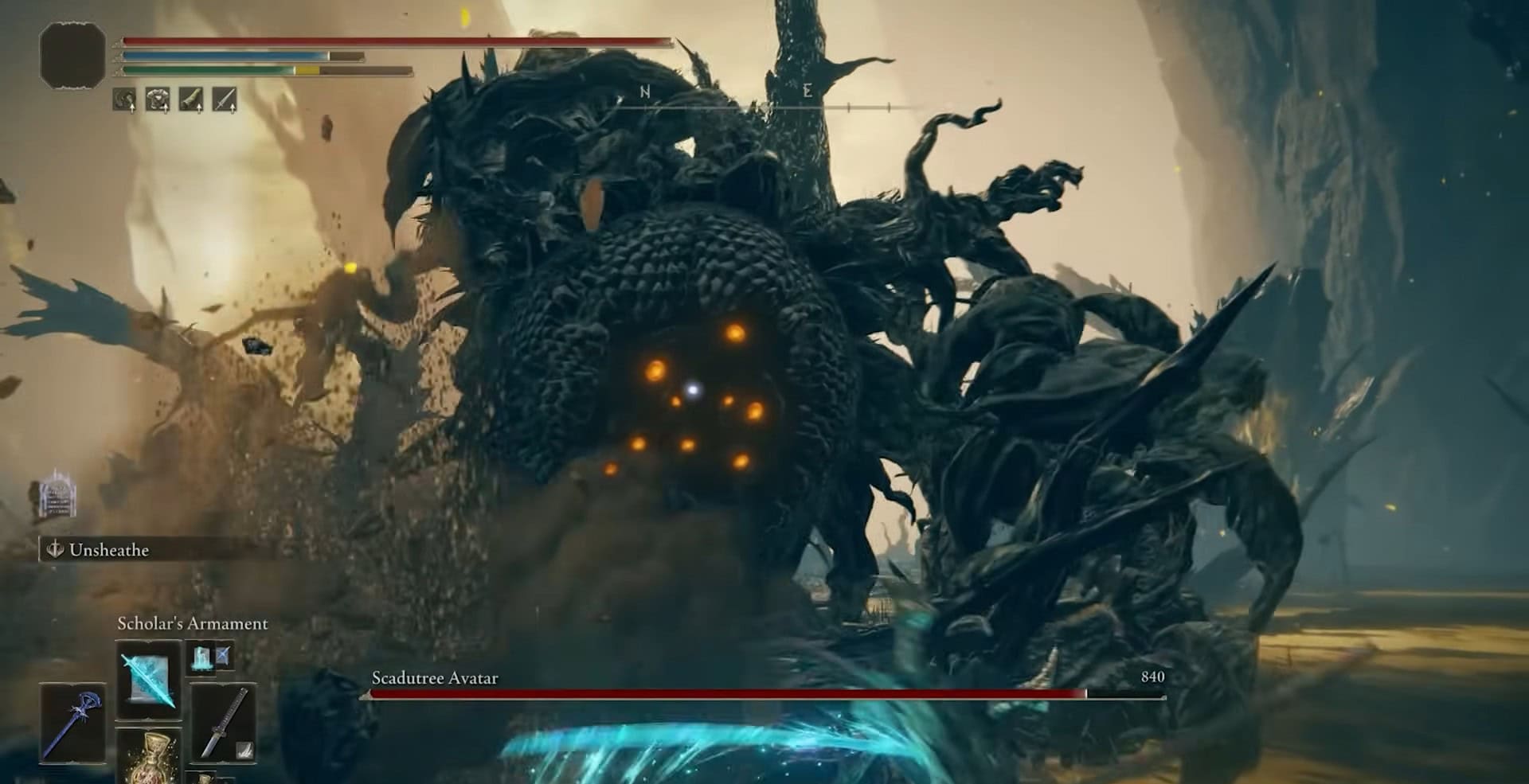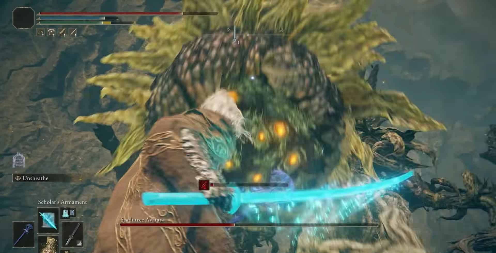 La fase 1 con l’avatar di Scadudre inizia sempre con l’attacco delle spine. Il boss oscillerà il braccio verso l’alto e ti lancerà un’ondata di spine di Scadutree. Puoi semplicemente rotolare attraverso di esso andando avanti.
