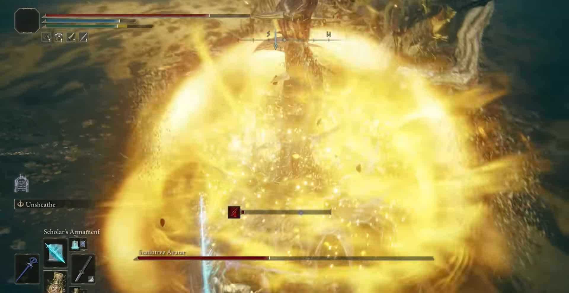 Il capo di Scadudree Avatar inizia la terza fase con una massiccia esplosione. Questo attacco è estremamente difficile da schivare. Assicurati di schivare all’ultimo secondo ed evitare le travi laser che escono dall’esplosione.