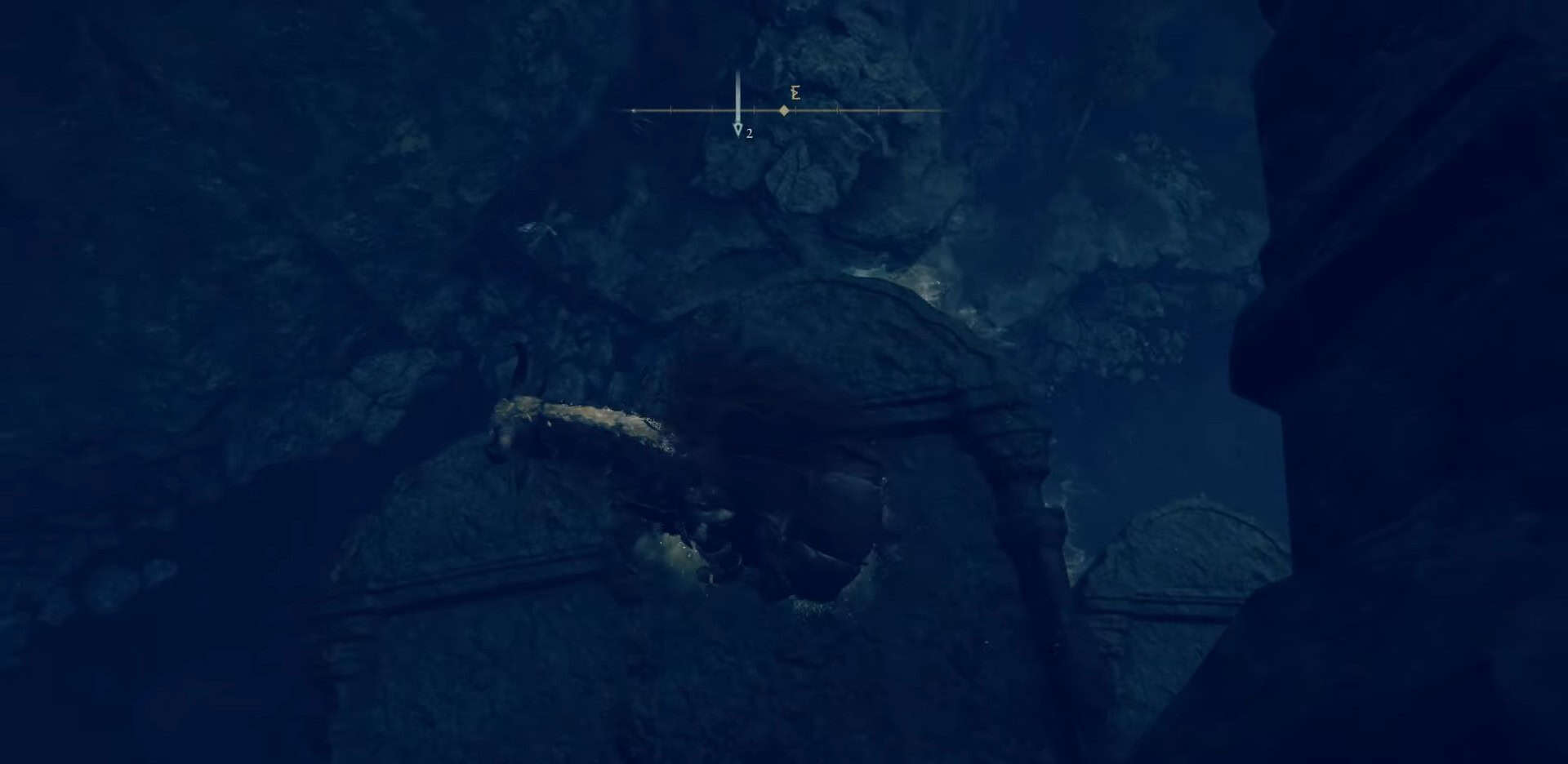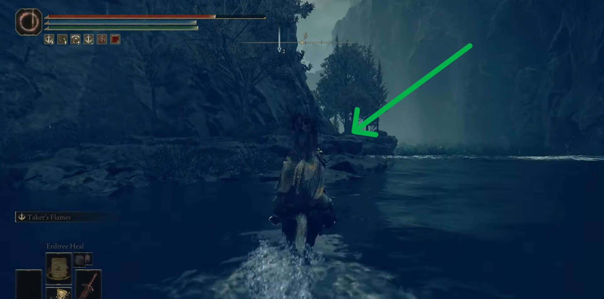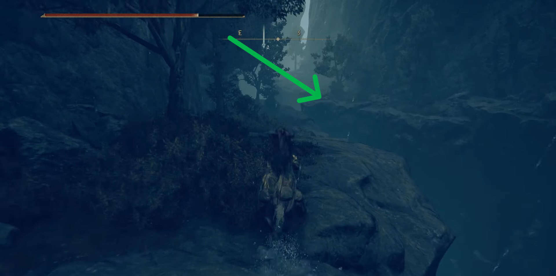 Da questo sito di grazia, gira a sinistra e scendi con cura usando le pietre tombali sporgenti. Questa è una caduta molto profonda e può ucciderti. Quando raggiungi il fondo vicino a una cascata, gira indietro e vai a destra.