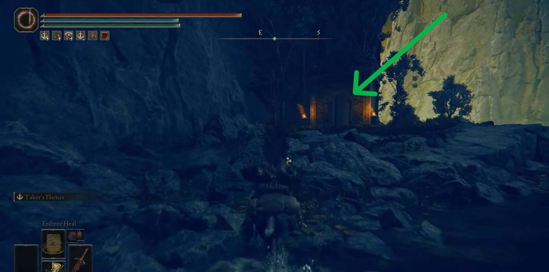 Continua a destra fino a quando non noti un edificio su una sporgenza sinistra vicino a una cascata. Entra nel mausoleo senza nome orientale nell’anello di Elden attraverso la porta con torce sui lati.