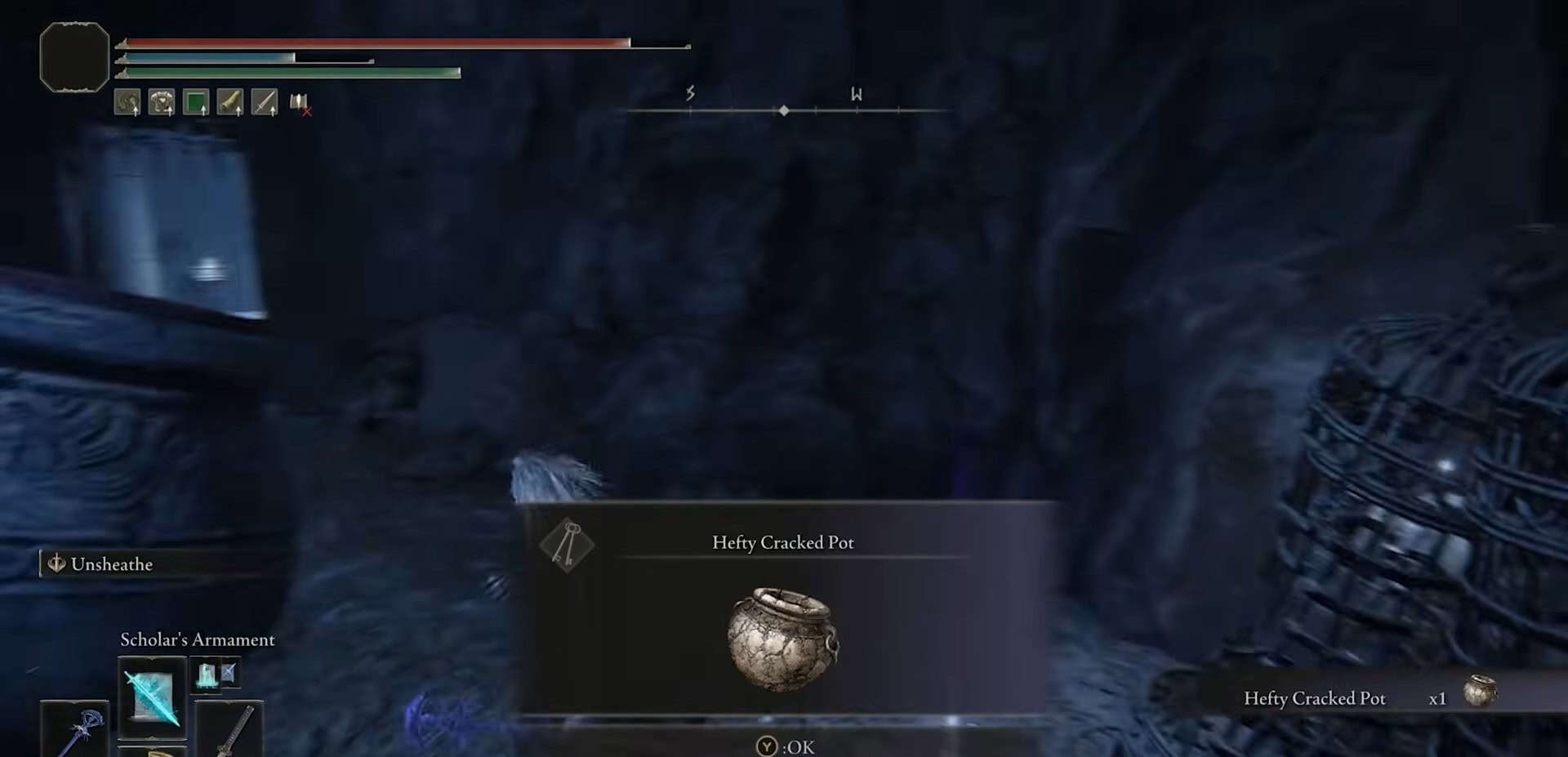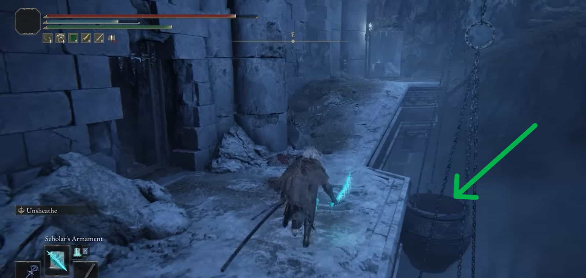 Torna indietro e scendi da un’apertura nel muro. Segui il percorso e gira immediatamente a sinistra. Abbraccia il muro sinistro e sconfiggi un barattolo nemico. Raccogliere 1x rune rotto da vicino a una cella di prigione.