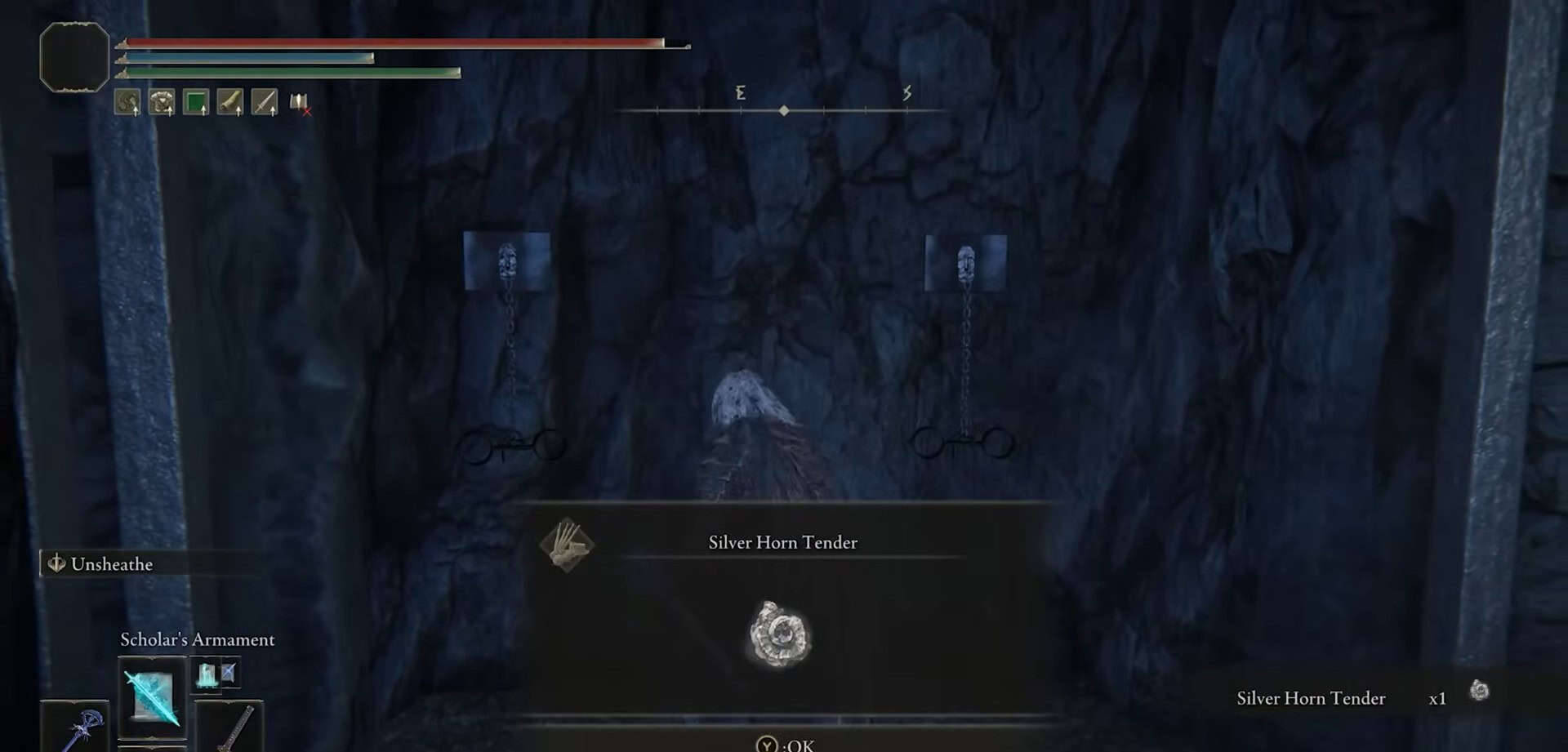 Svoltare immediatamente a sinistra e scendere le scale. Raccogliere 1x corno d’argento tenero da un cadavere all’interno di una piccola cella di prigione a sinistra.