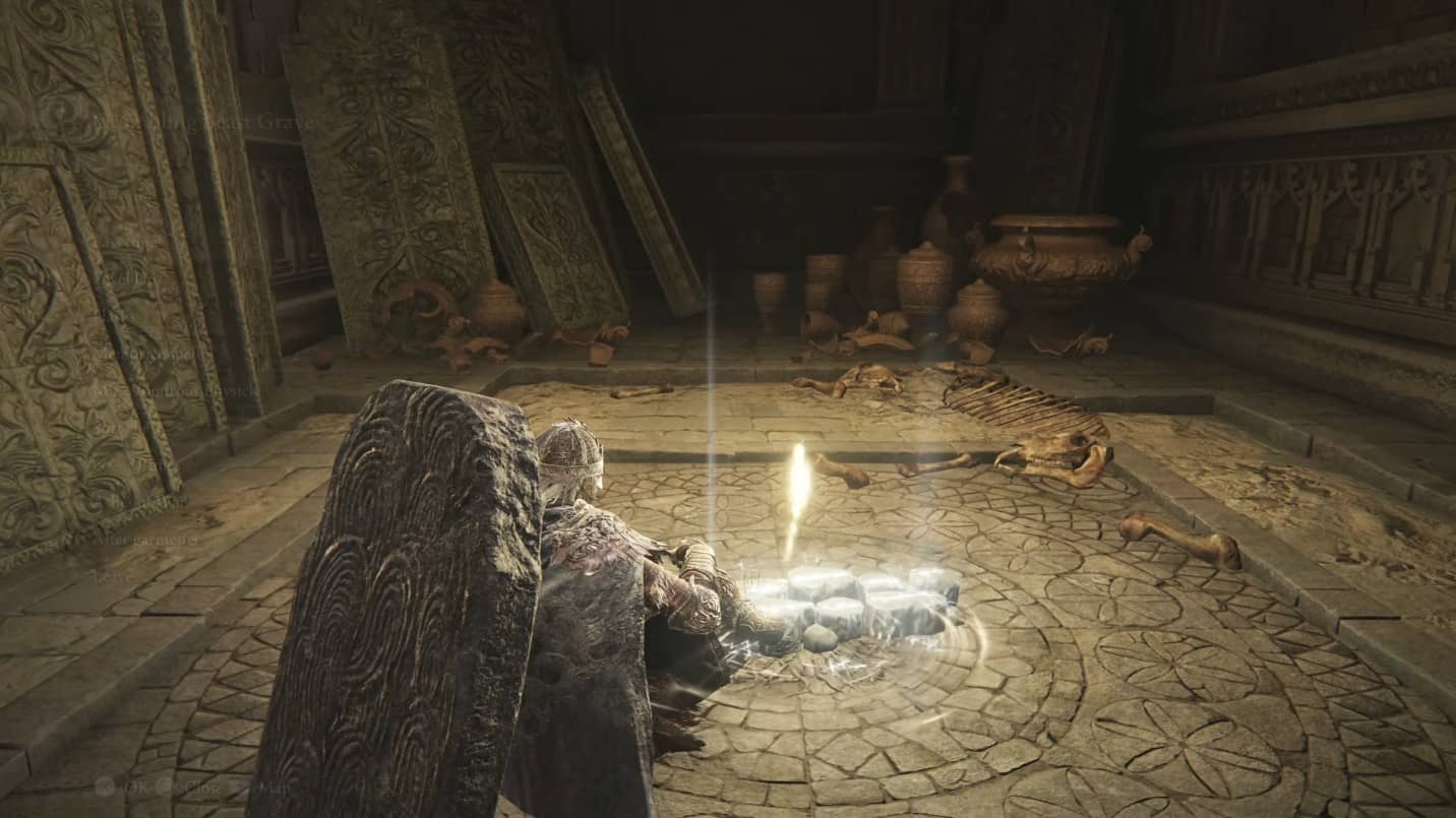 Dal luogo della grazia dirigiti a nord-ovest verso la porta in una grande stanza con tre bare sul tavolo, uccidi gli uomini bestia nella stanza e raccogli le pietre da forgia, ora salta sul tetto a nord-ovest ed entra nell’edificio. Qui troverai ghiaia e grande tomba Glovewort.