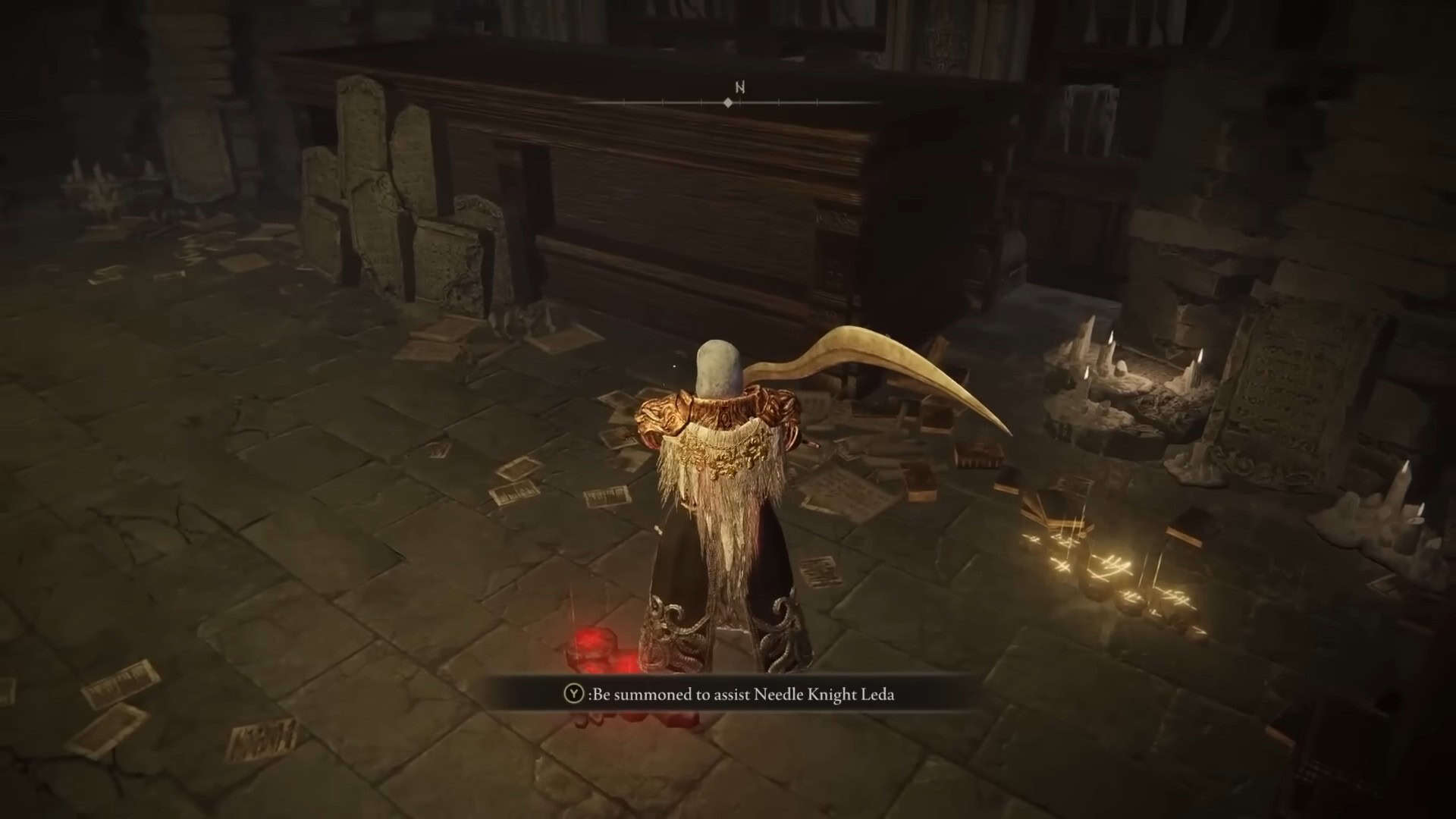 Attraversa l’intero castello Ensi fino a raggiungere la sua fine. Qui è dove dovrai affrontare Rellana, Twin Moon Knight. Usa il cartello di convocazione di Leda fuori dalla porta del capo per convocarla per la lotta.