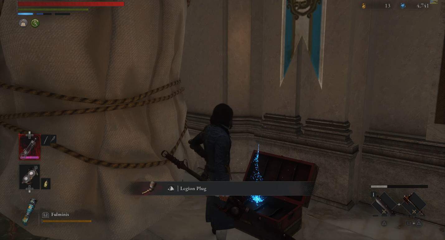 Attraversa quel cancello e poi prendi le scale sul lato destro. Entra nella galleria e continua dritto. Girate a sinistra nella stanza più lontana e dirigetevi verso le scale. Scendete e abbracciate il muro a sinistra per fare un’inversione a U. Sali le scale e il baule contenente il Legion Plug sarà proprio lì, lungo il muro.