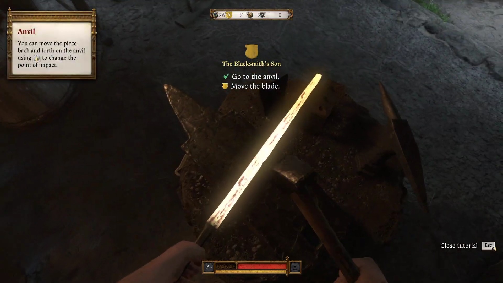 La parte successiva prevede che martellare il metallo per renderlo in pareggio. Premere il Grilletto destro O Pulsante del mouse sinistro Per martellarlo e spostare lentamente il pezzo di metallo su e giù per colpire diversi punti. Ricorda di martellare ogni punto da un lato, capovolgilo usando il X O Chiave quadrata, e quindi ripetere il martellare.