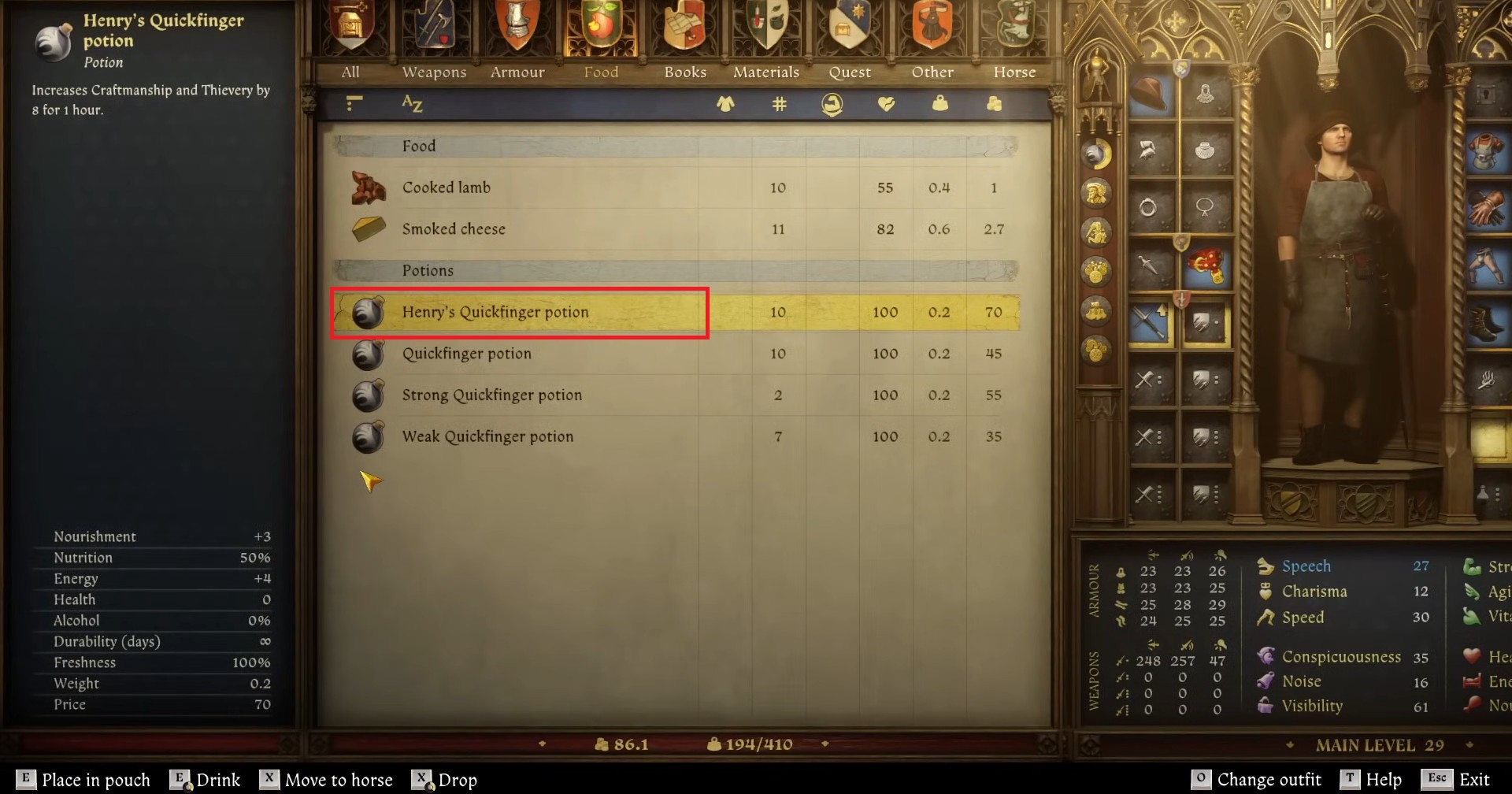 IL Pozione Quickfinger di Henry Aumenta l’artigianato e il furto di 8 per 1 ora di fila. Puoi ottenere questa pozione da Kuttenberg Apothecary o Aranka. Si noti che il prezzo della ricetta di questa pozione varia a seconda del commerciante da cui lo stai acquistando.