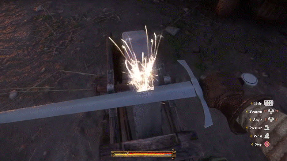 Dopo aver forgiato le tue armi, potrebbero essere danneggiati in battaglie. Puoi spendere soldi per ripararli o utilizzare una mola per ripararli. Per affilare facilmente le armi, lasciare al massimo la quantità di pressione premendo e tenendo conto dell’uso il grilletto giusto e premendo il Grilletto sinistro ripetutamente per girare la ruota.