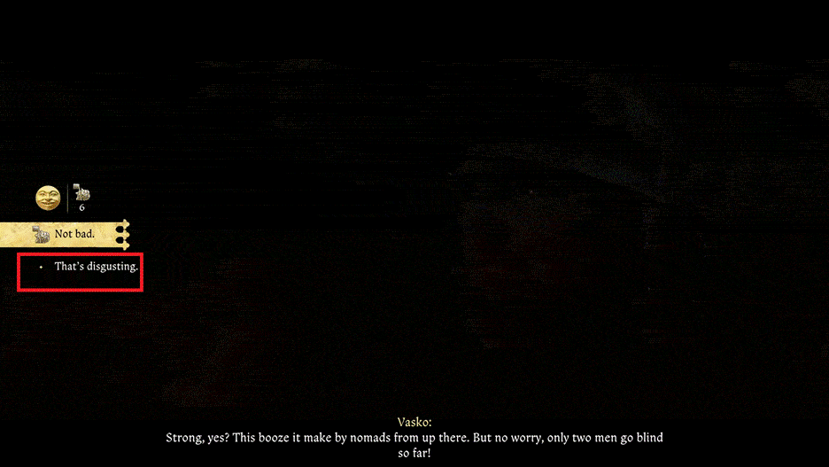 Dopo aver parlato con il cane, seguilo e ti porterà direttamente alla scorta di alcol. Porta la scorta al campo e bevi ancora un po ‘con Vasko. Alla fine, parlagli di Troskowitz e accetterà di non tornare di nuovo.