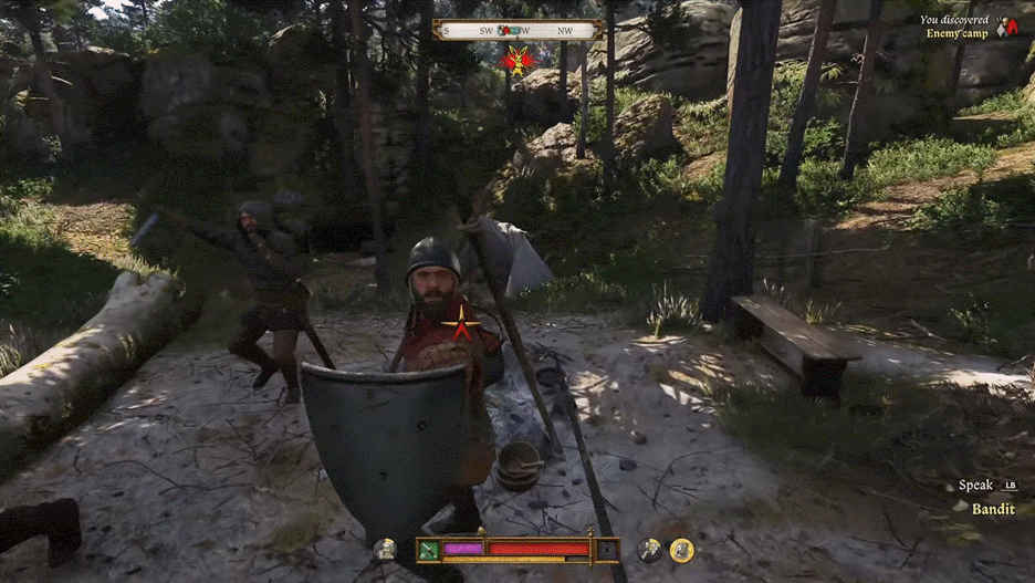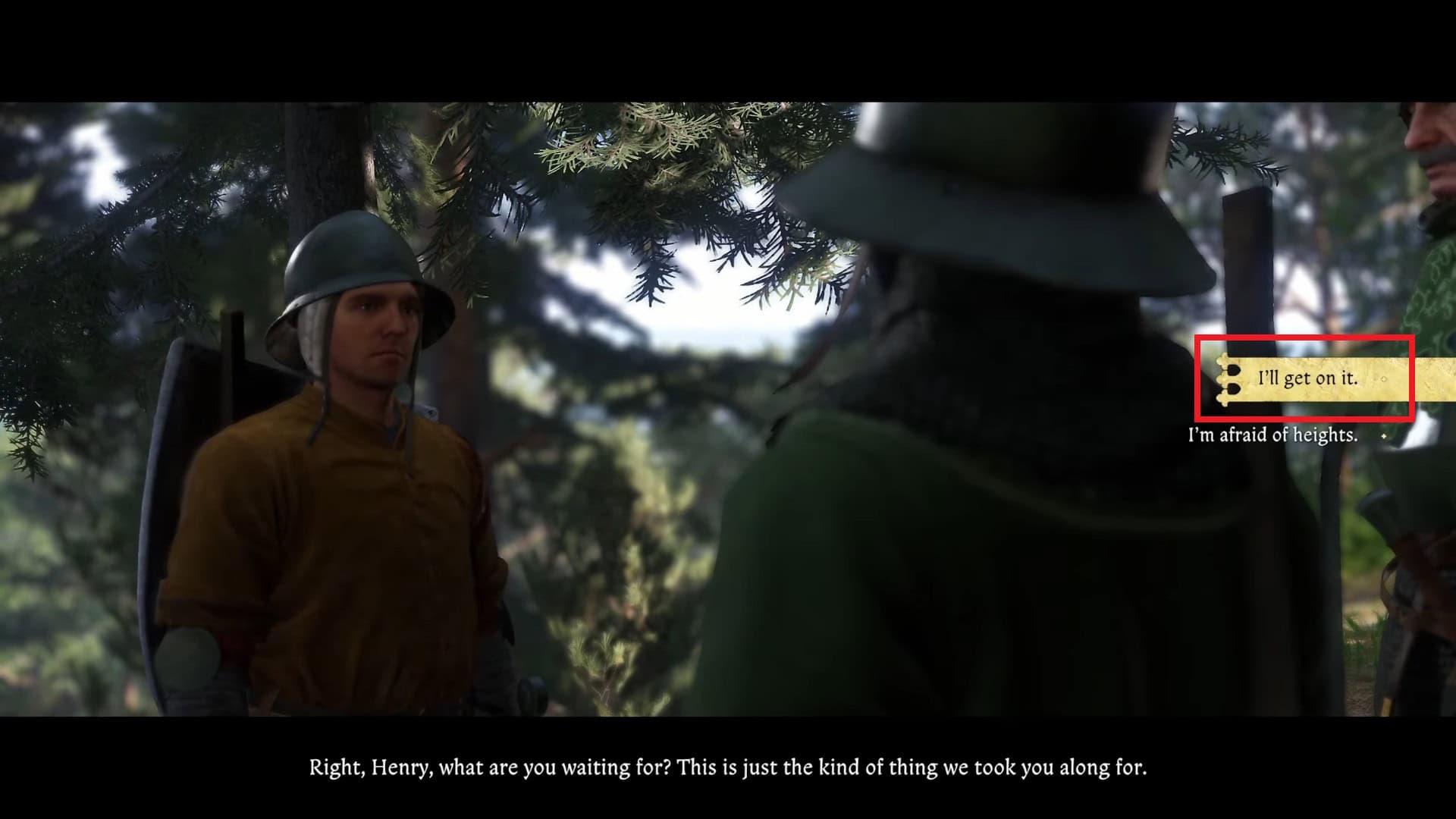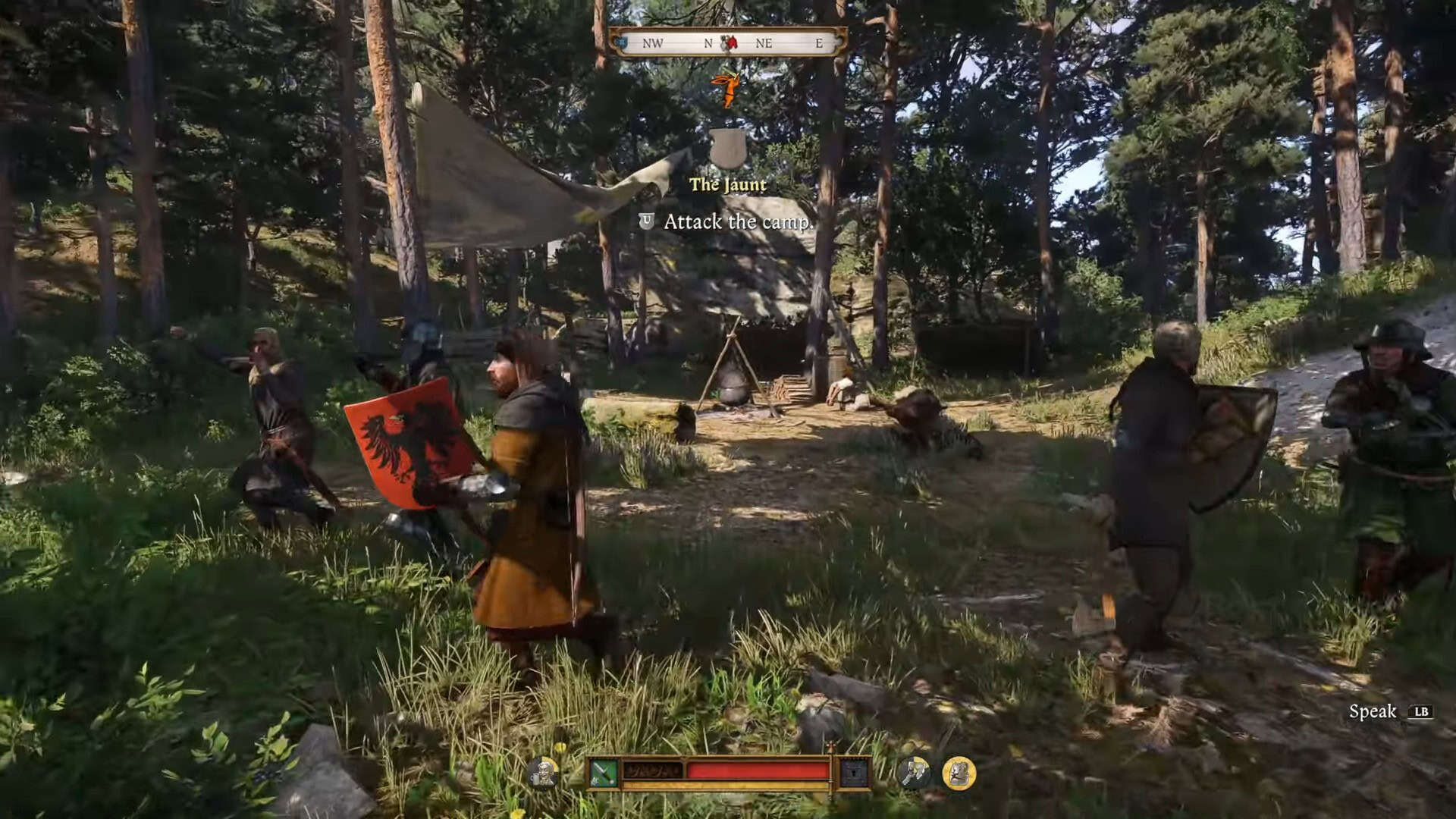 Una volta che tutti hanno finito di ispezionare il carrello, segui Lord Semine e nodoso nell’area del campo in cerca di banditi. Dirigiti sulla montagna, fermati a parlare con loro e ti manderanno a scouting.
