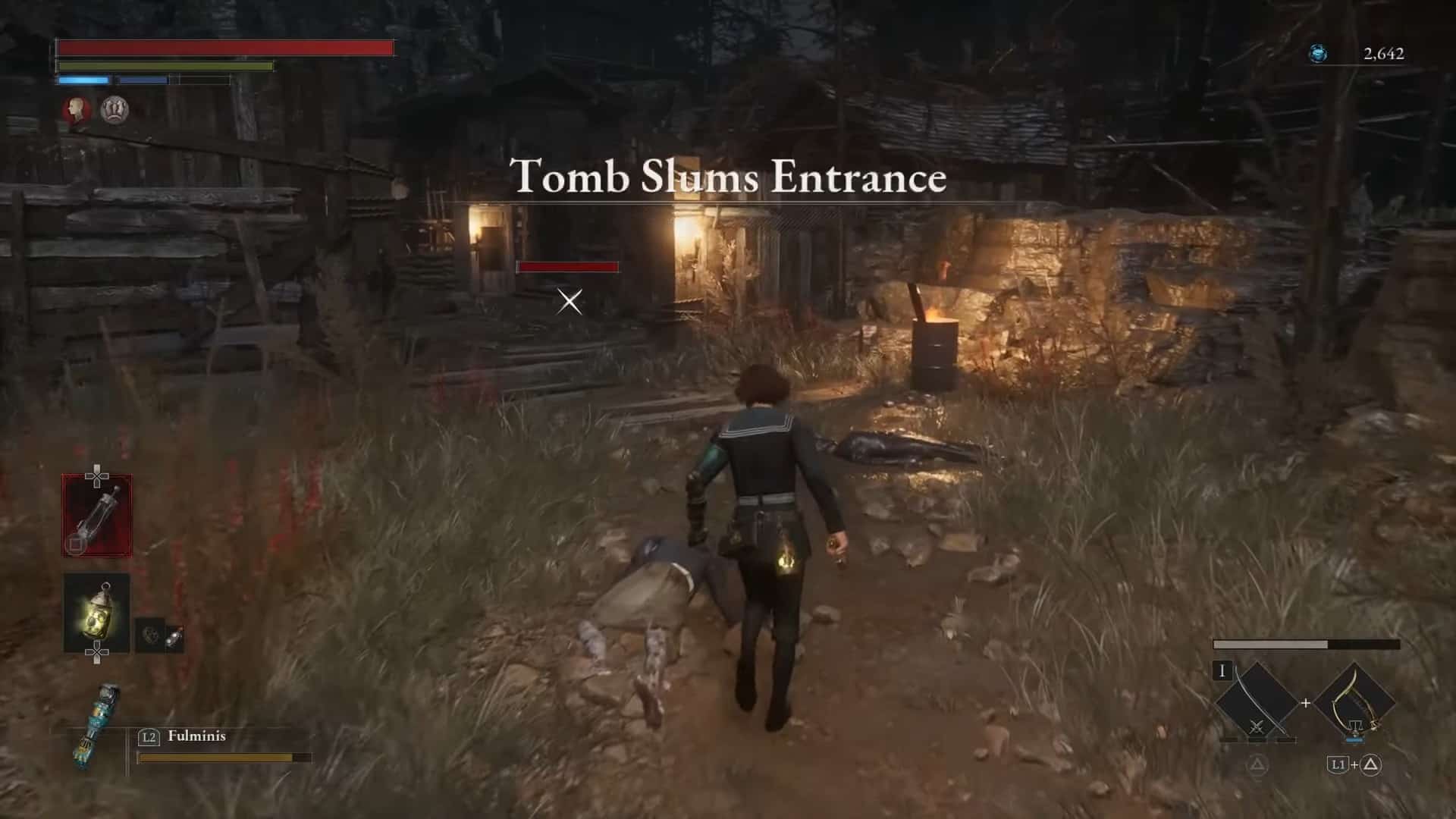 Continua il tuo viaggio per raggiungere la seconda sezione del Sentiero del Pellegrino, Ingresso dei bassifondi della tomba in Lies of P. Fai attenzione a tre nemici normali e a una grande carcassa non appena entri nei bassifondi. Vai alla capanna più a destra per ottenere un Attributo Ampolla di resistenza.