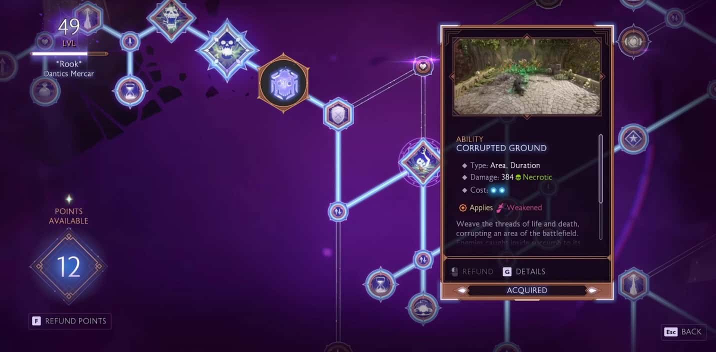 La prima abilità che sbloccherai è la Tiro arcano. Questa è la tua principale abilità di cerbottana e la utilizzerai spesso in questa fase. Questo infligge 453 danni da fuoco e infligge Bruciatura ai tuoi nemici in caso di colpo. Successivamente, andrai per Nova gelata. Questo non infligge molti danni con 48 danni da freddo ma congela il terreno intorno a te in un’area. La tua terza abilità sarà Terreno corrotto che infligge 204 danni necrotici con ogni lancio. Questa è un’abilità di durata dell’area che applica l’effetto indebolito. Lanciarlo costa 2 punti mana.