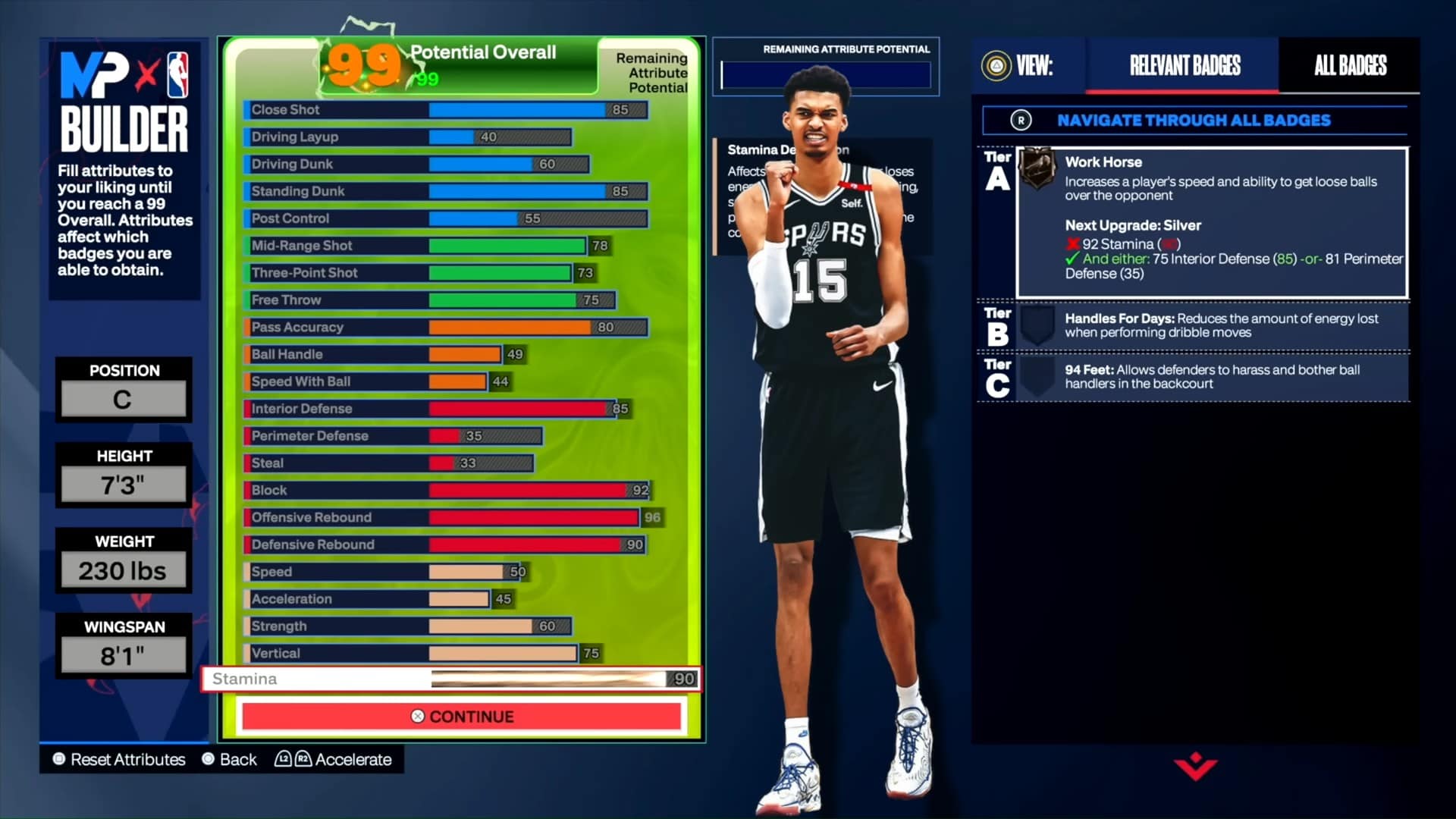 Per cominciare, stiamo mettendo 85 punti Tiro ravvicinato e 85 punti dentro Schiacciata in piedi. Con la quantità di rimbalzi offensivi che sperimenterai, è altamente raccomandato avere un’alta statistica di tiro ravvicinato per sfruttarli. Le statistiche aiutano anche a sbloccare abilità utili per il post-punteggio, come Rise Up e Fast Twitch.