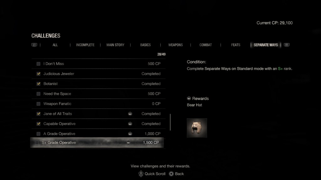 - Orecchino dell’orso carino: si sblocca quando si completa Separate Ways in modalità Hardcore o superiore con un grado A. Per ottenere un grado A in Hardcore, devi batterlo in meno di due ore e mezza.