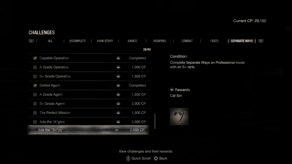 - Cat Set (garantisce munizioni infinite): si sblocca completando Separate Ways con un grado S+ a livello Professional. Per ottenere un grado S+ in Professional, devi batterlo in meno di due ore e mezza con meno di 10 salvataggi.