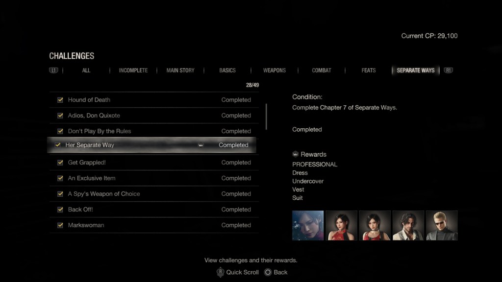 - Dress, Undercover (Ada): Entrambi si sbloccano dopo aver completato Separate Ways.