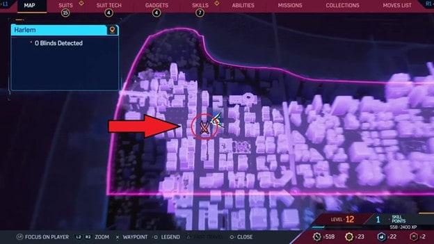 Il secondo rifugio del cacciatore si trova nella parte in alto a sinistra del quartiere di Harlem in Spider-Man 2. Passa alla posizione sulla mappa in alto e inizia a ripulirlo.
