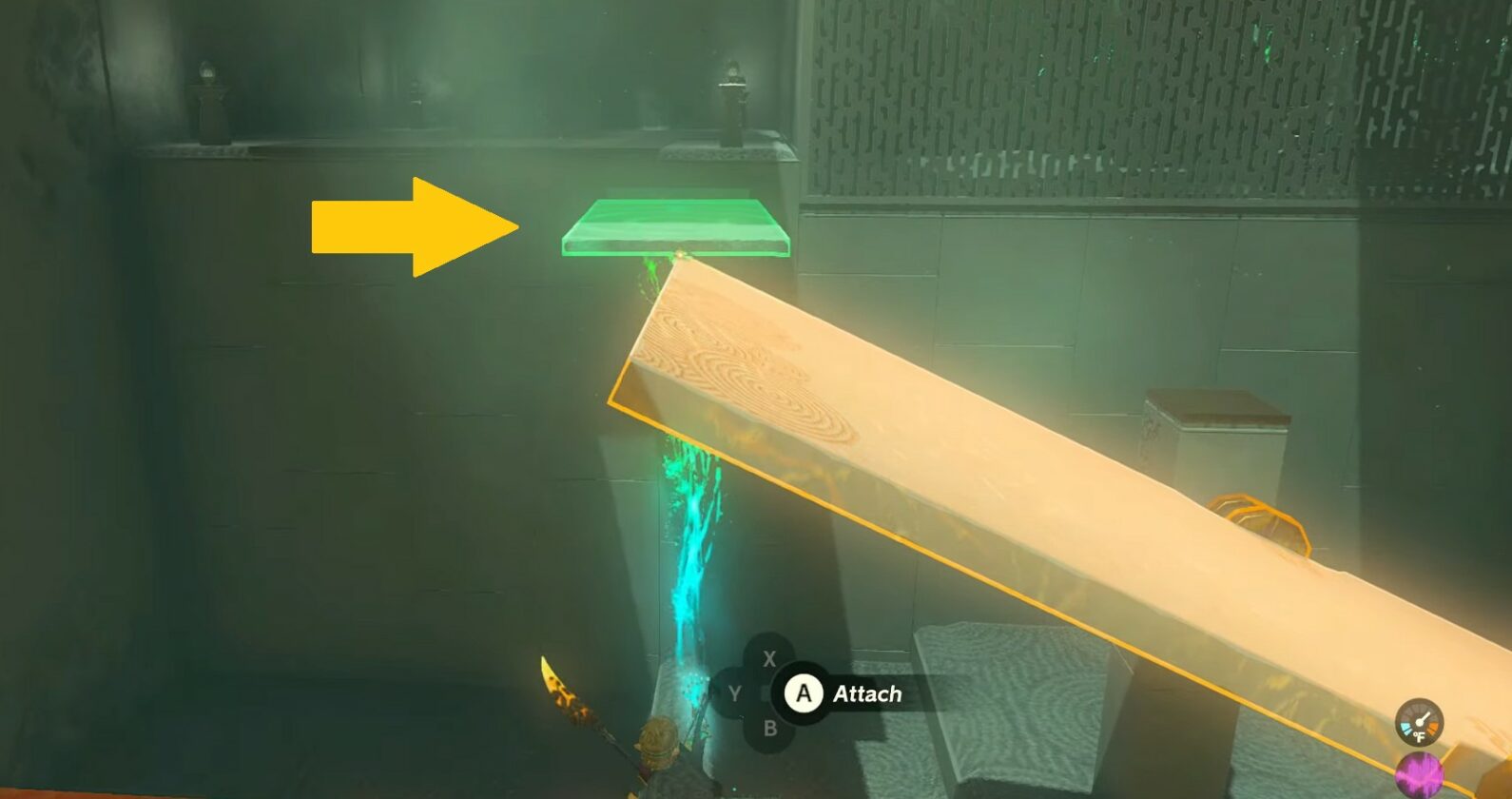 Afferra la canna che giace nelle vicinanze e attaccala all’estremità superiore della leva usando Ultrahand. Una volta abbassata l’estremità superiore della leva, puoi camminarci sopra per raggiungere il livello superiore della stanza.