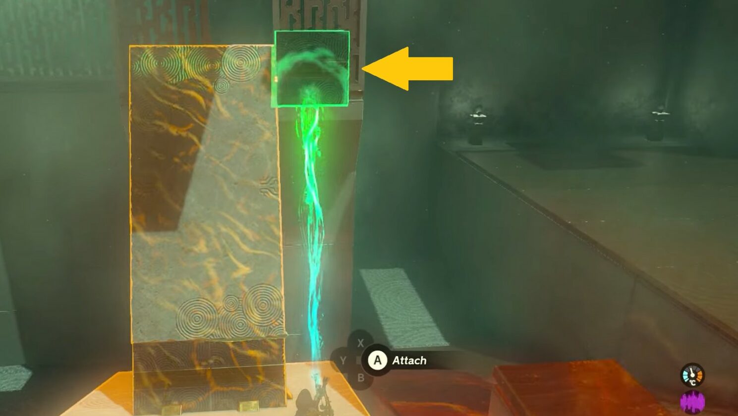 Parapendio torna alla leva e guarda la sua estremità inferiore che ha tre cubi su di essa. Al di sopra di questa estremità si trova l’ingresso alla sala dell’altare. Equipaggia Ultrahand e prendi di nuovo la lastra che hai usato per raggiungere il forziere.