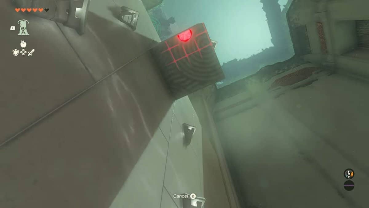 Dopo essere salito attraverso la sporgenza, vai a destra dove vedrai un grande cubo che devi afferrare usando l’abilità Ultrahand. Scegli il cubo e portalo completamente a sinistra dove si trova un altro cubo simile e posizionalo sopra l’altro cubo.