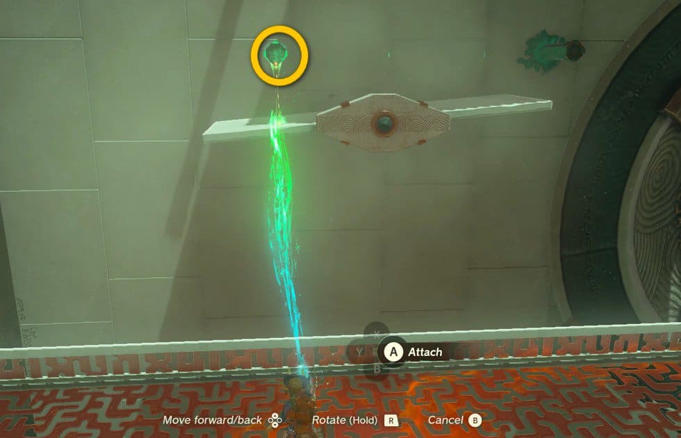 Inizia usando la tua abilità Ultrahand per afferrare il piatto con un paletto che sporge da esso. Spingete il palo nel pilastro che sale a sinistra per colmare il vuoto tra la piattaforma e il pilastro.